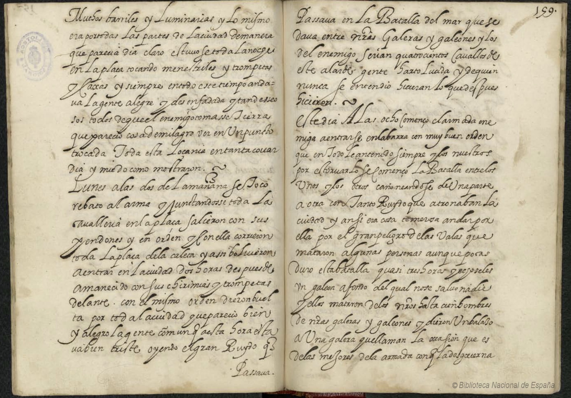 “Lunes [1 de julio], a las dos de la mañana, se tocó rebato al arma y juntándose toda la caballería en la plaza salieron con sus pendones y en orden y con ella corrieron toda la plaza de la Caleta y así volvieron a entrar en la ciudad dos horas después de amanecido con sus chirimías y trompetas delante con el mismo orden dieron vuelta por toda la ciudad que pareció bien y alegró la gente común que a esta hora estaba bien triste oyendo el gran ruido que pasaba en la batalla del mar…”.