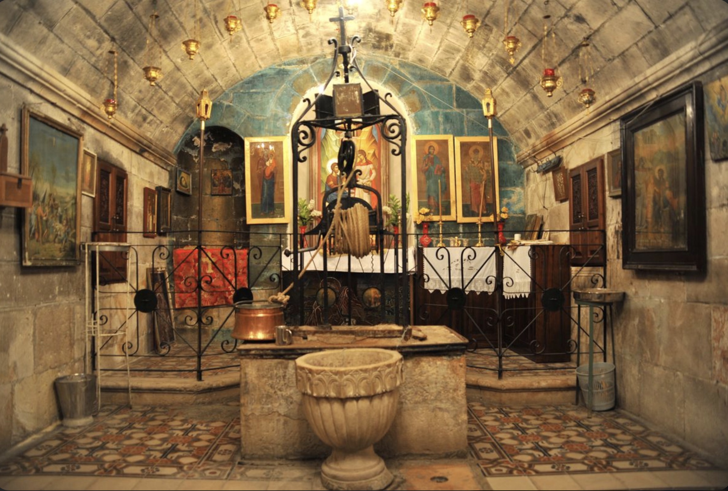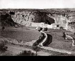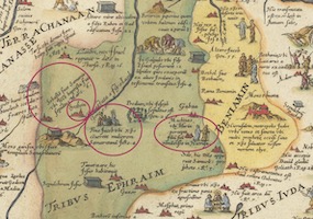 La salida, probablemente por la puerta de Damasco, debió ser especialmente emotiva, contándonos Guerrero como iban despidiéndose de los santos lugares y “los benditos montes Sión y Olivete”, los cuales perdieron de vista transcurrida media legua (algo más de dos kilómetros y medio). En ese lugar vieron la iglesia en la que, según la tradición cristiana, el profeta Jeremías, mirando desde ese punto la ciudad, compuso las Lamentaciones. La tradición cristiana ubica la llamada “Gruta de Jeremías” fuera del muro norte de Jerusalén. Esta gruta se halla al pie de la colina ahora llamada “Gólgota”, la misma en la que se levantó la cruz de Cristo. Hicieron noche a tres leguas de Jerusalén (unos dieciséis kilómetros y medio), en una ciudad “destruída la mayor parte”. En este punto debían aguardar a una caravana de treinta y tres camellos “de mercaderes moros”, para hacer el camino con mayor seguridad. La única clave que Guerrero nos da para identificar este lugar es que la tradición decía que aquí fue el lugar en que Jesús y María se dieron cuenta de que Jesús, que ese momento tenía doce años, no se encontraba en la caravana en la que regresaban de Jerusalén a Nazaret tras la celebración de la Pascua, volviendo a esa ciudad donde lo encontraron en el templo con los doctores (Lucas 2: 41-50). He podido localizar este lugar en el mapa Descriptio et situs Terrae Sanctae alio nomine Palestina multis preclaris historys et miraculis utriusque testamenti a Christo Salvatore nobilitata (véase recurso). Aparece identificado como “Machinas”. Se trata de la antigua ciudad bíblica de Michmas, actualmente conocida como Mukhmas.1