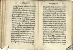 "En este camino no vimos cosa notable, más de encontrar muchos señores y caballeros turcos, con mucha gente de a pie y de a caballo y muchos camellos cargados de sus recámaras y mujeres y familias que iban al Cairo. Aquí, en este camino, me dio un lacayo turco con un palo un buen golpe, no más que por su pasatiempo y fuese riendo él y sus compañeros".