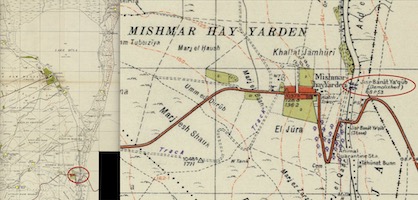 Alejándose del lago Tiberiades, ya que el compositor nos dice que caminaron “por montañas bien ásperas”, llegaron a la ribera del río Jordán: “que aunque no fue por esta parte el baptismo de Cristo nuestro Dios, por ser el mesmo río, fue grande el alegría y devoción que nos dio su vista”. A pesar del descontento de los moros que conducían la caravana, todos fueron hasta el río para beber agua y remojarse con ella, anotando Guerrero que era: “cristalina, fresca y muy dulce”. En este punto, el río Jordán no era muy ancho y lo atravesaron por un puente desde el que: “miramos a la mano siniestra unas lagunas que se dicen las aguas Meronas que son así mesmo del río Jordán”. Esta referencia nos permite situarlo con bastante precisión. Como ocurre con otros muchos lugares bíblicos, la ubicación que investigaciones más o menos recientes hacen de ellos no se corresponden con los emplazamientos con los que se conocían en la Edad Moderna. En tiempos de Guerrero, las renombradas “aguas de Merón”, lugar en el que se situaba la gran batalla en la que Josué derrotó a Jabín, rey de Hazor, y a sus aliados cananeos (Josué 11: 5,7), se identificaban con el actual Lago de Hulé (Huleh), alimentado por las aguas del río Jordán, a 16 km al norte del Mar de Galilea. El lugar por el que cruzaron se encontraba en la zona del río Jordán conocida como el vado de Jacob (próximo a las ciudades de Mishmar HaYarden y Gadot), donde estaba el puente medieval “de las hijas de Jacob” (Gesher Bnot Ya'akov, en árabe), reemplazado en 1934 por un puente moderno unos metros más al sur (ver recurso).