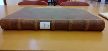Encuadernación original, en tabla revestida de cuero marrón, con cinco nervios.Buen estado de conservación, con algunas manchas de humedad.