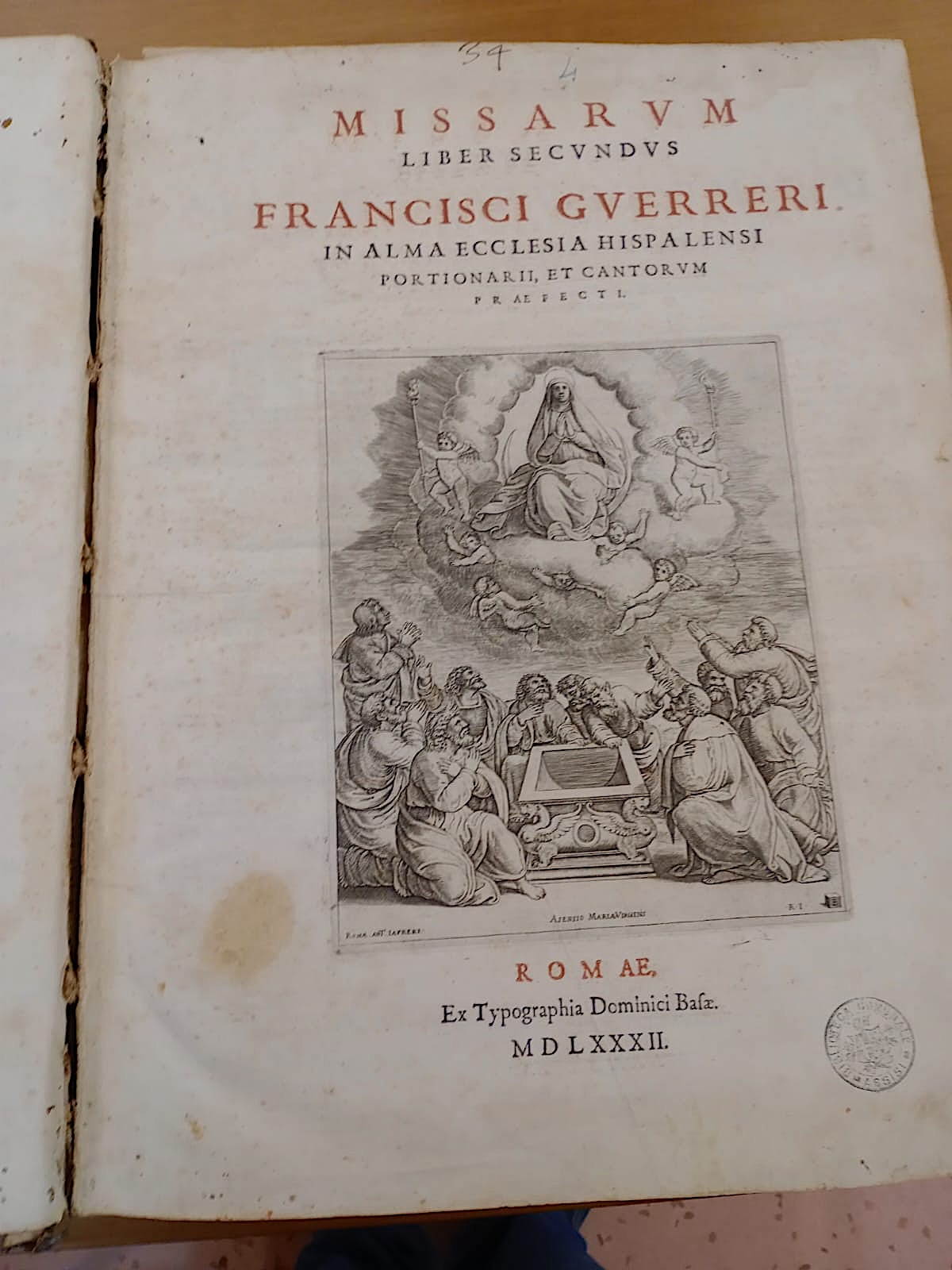 En el prefacio del padre Giuseppe Zaccaria al catálogo realizado por Claudio Sartori entre 1959 y 1951, dividía sus ricos fondos musicales en dos secciones, conocidas como Fondo di Cappella (FC) y Fondo del Maestro di Cappella (FMC): “Una divisione che corrisponde, nel Fondo di Cappella, all'attenzione verso la musica come scienza e arte, e, nella sezione del Fondo del Maestro di Cappella, del suo uso liturgico”. Sartori catalogó la primera sección, la cual contiene obras de los siglos XIII al XIX, con un importante número de manuscritos, destacados impresos y 58 volúmenes de literatura musical. Es en esta sección donde se encuentran los dos impresos de Francisco Guerrero que han llegado hasta nuestros días. Tras haberse trasladado el Fondo di Cappella a la Biblioteca Comunale de Asís, abierta al público en 1888 y con sede definitiva en el palazzo Vallemani desde 1902, en 1981 regresó a las instalaciones de la Biblioteca del Sacro Convento, donde desde hacía tiempo ya se había instalado el Fondo del Maestro di Cappella. Agradezco al bibliotecario Stefano Cannelli las imágenes enviadas para la ilustración de este artículo.