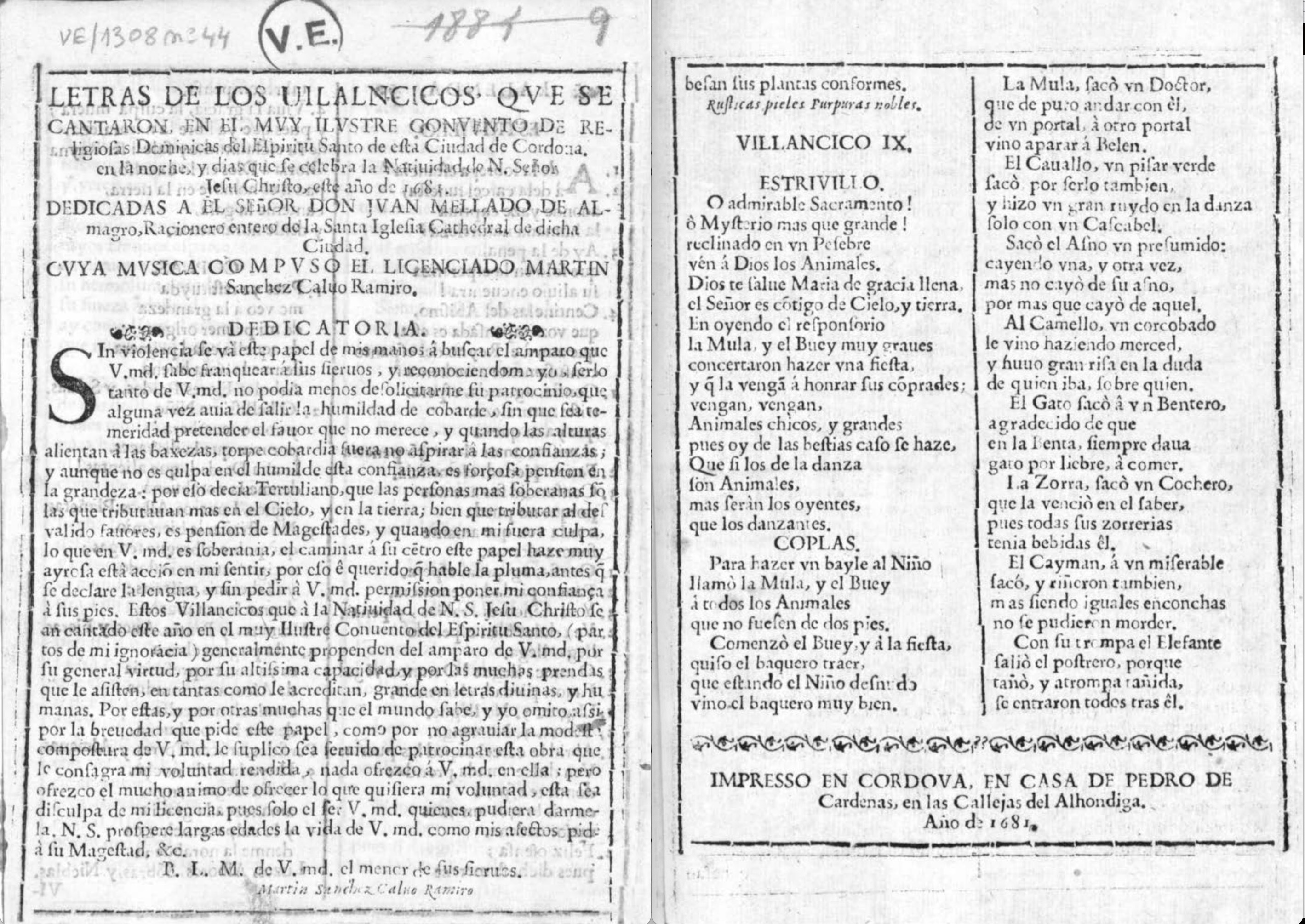 Los textos están dedicados a Juan Mellado de Almagro, racionero de la catedral de Córdoba, por el licenciado Martín Sánchez Calvo Ramiro, compositor de la música. Muy probablemente se trata de Martín Calvo Ramírez que ganó las oposiciones al magisterio de capilla de la colegiata del Salvador de Sevilla, convocadas en enero de 1687, ya que procedía de Córdoba y era asistente del maestro de capilla de la catedral, en esa fecha Juan Pacheco Montón (= Montión). Ese mismo año, Calvo Ramírez opositaría al magisterio de capilla de Almería y previamente lo había hecho al mismo cargo en la colegiata de Castellar (Jaén), recomendado por Pedro de Soto, maestro de capilla de la catedral Jaén, en 1679, en ambos casos sin éxito. Desconocemos si fueron las propias monjas las que cantaron estos villancicos o si contrataron a un grupo de músicos externos para ello: