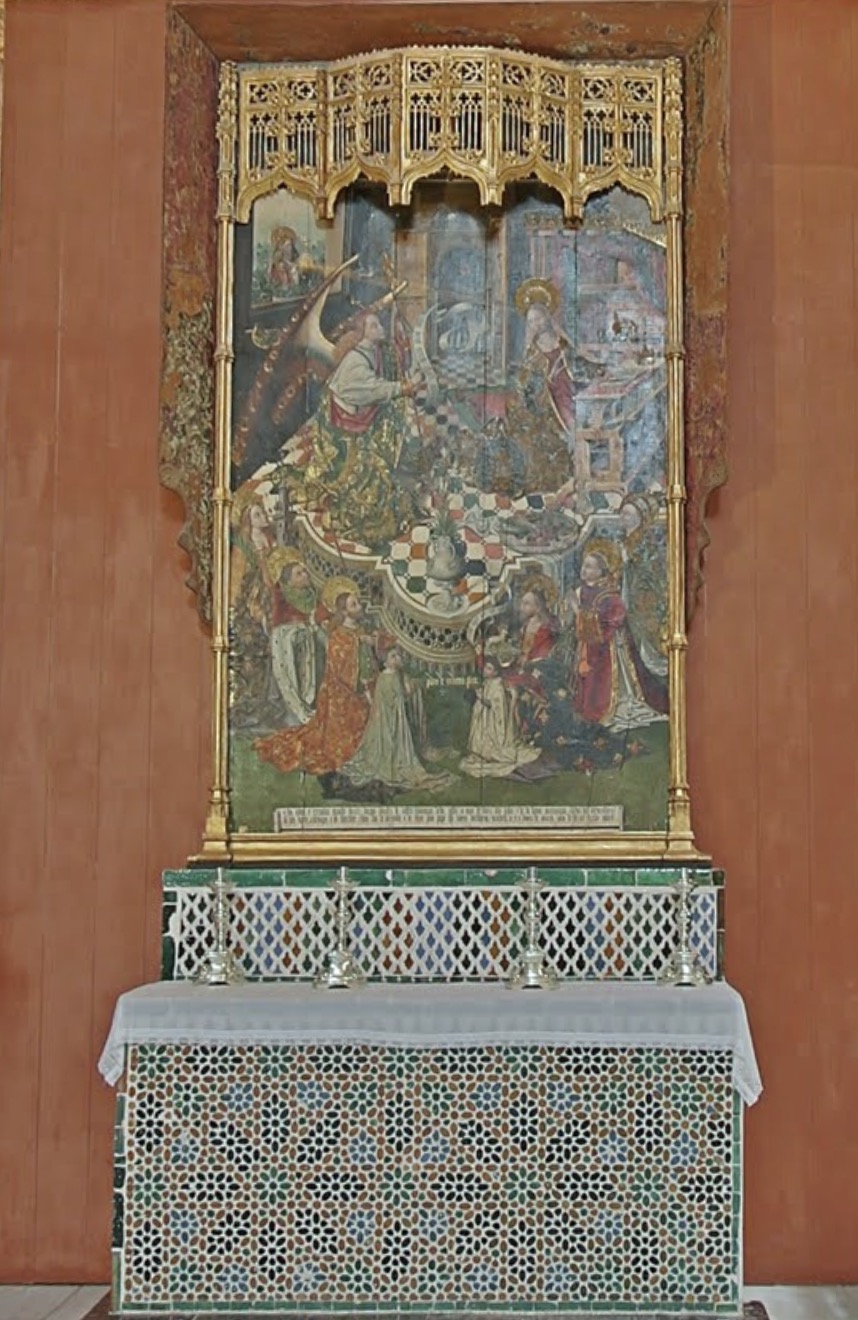 El 20 de marzo de 1475, según puede verse en la leyenda de su parte inferior, el pintor Pedro de Córdoba terminaba la obra comisionada por Sánchez de Castro para decorar su renovado altar. En ella se representa la Anunciación, como escena principal, a cuyo pie se encuentran, de izquierda a derecha: Santa Bárbara, San Ibo de Bretaña, Santiago (que toca la figura de Sanchez de Castro), San Juan Bautista (que, como he señalado, hace lo propio con la de Muñoz), San Lorenzo y San Pío I. El retablo está colocado sobre un altar cuyo frontal y laterales están revestidos de un alicatado mudéjar para el que no se ha podido precisar la fecha de ejecución.