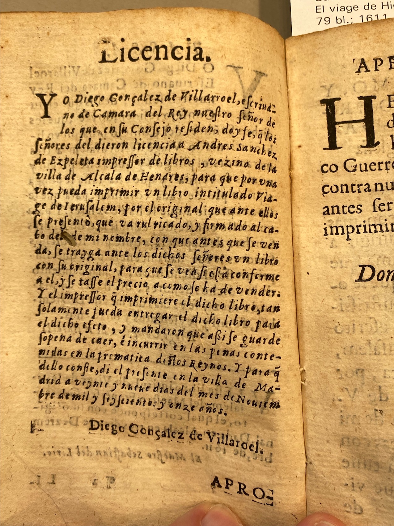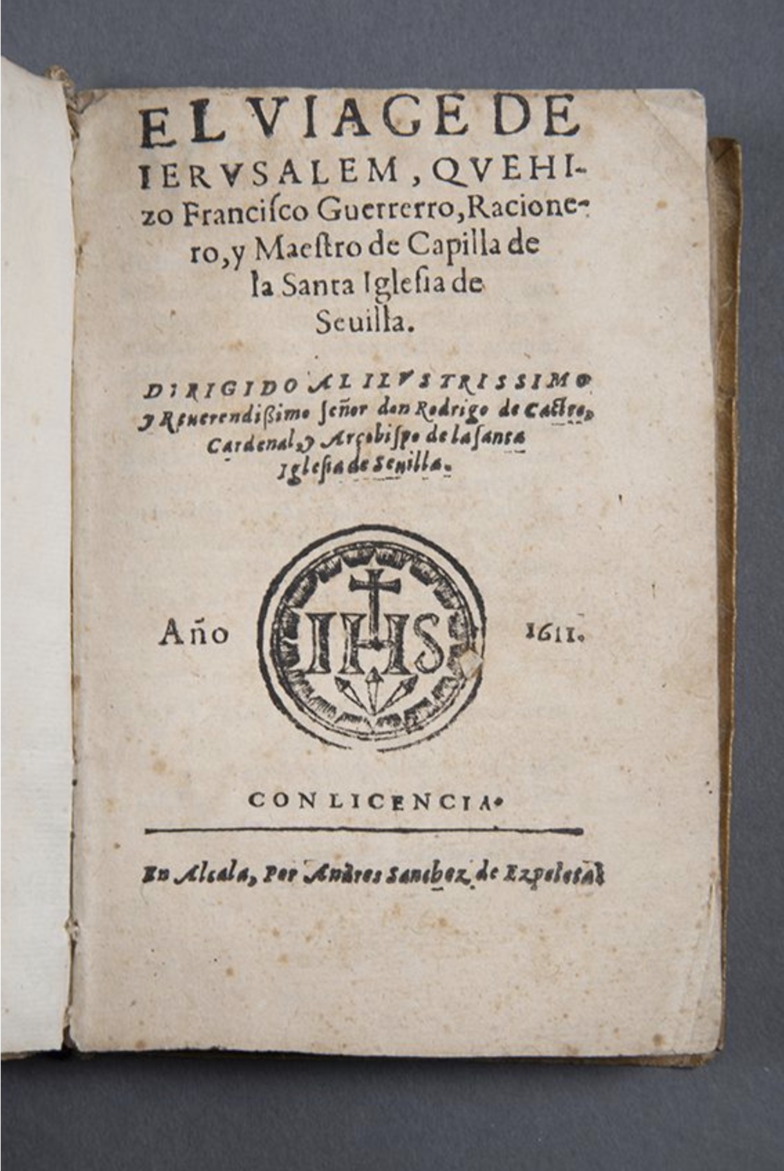 Edición de El viage de Hierusalem (1611) de Francisco Guerrero impresa en los talleres de Andrés Sánchez de Ezpeleta en Alcalá de Henares.