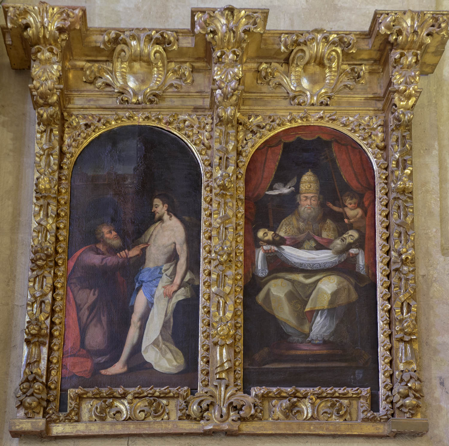 La ubicación que este altar tenía en el siglo XVIII puede verse claramente en los planos de 1741 y 1767, así como en un grabado del siglo XIX, en el que la configuración del retablo y las imágenes de sus lienzos no responden a la realidad (ver recurso). Actualmente, el retablo barroco de este altar, aislado, se encuentra en la posición que tenía tras la citada remodelación efectuada en el siglo XVIII. En él hay dos lienzos: en el de la izquierda se representa la Incredulidad de Santo Tomás, en el de la derecha está la figura del papa San Gregorio, asistido por el Espíritu Santo, en forma de paloma, exhibiendo las cabezas de los apóstoles San Pedro y San Pablo sobre un lienzo (ver recurso).
