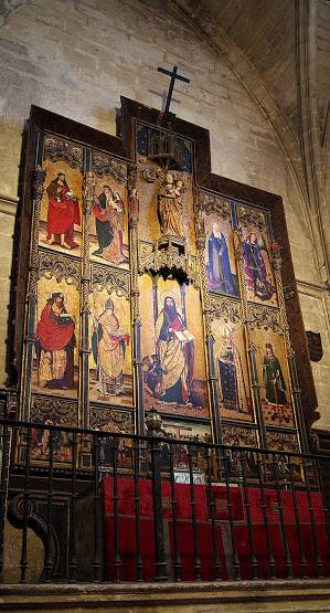 El 11 de febrero de 1486, el canónigo y arcediano de Sevilla Nicolás Martínez Marmolejo redactaba su testamento ante Antón Morales, notario público por la autoridad apostólica. Este testamento incluye una cláusula de especial interés. En ella nos da cuenta que “desde muchos días acá”, por su devoción, estaba patrocinando “facer cantar una Misa sabatina de Santa María cada sábado del año, luego que amanece”. Esta misa era oficiada por uno de los curas de la Capilla de San Clemente (Sagrario de la catedral) y en ella “cantan los seis mozos con su maestro que sirven en la dicha Santa Iglesia de canto de órgano”. En esta cláusula establecía que esta misa se siguiera diciendo, de la misma manera y a la misma hora, “en el lugar e altar más cercano a mi sepultura”. Para ello deja 4.000 maravedís de renta perpetua anual, de los cuales se pagarían, tal y como ya se estaba haciendo: al cura que dijera la misa quince maravedís por cada una de ellas, al maestro de los mozos otros quince maravedís, al sacristán de la capilla de San Clemente diez maravedís, porque “aderece” el altar, y a cada uno de los mozos cinco maravedís cada sábado. El total ascendía a 60 maravedís que se librarían después de terminada la misa semanal. Deja por administrador de las rentas de esta dotación al magister puerorum que en ese momento desempeñara este cargo. La misa que se oficiaría sería la correspondiente a ese día. Dejaba para esta misa la casulla blanca de seda, alba, manípulo, estola y amito con que en ese momento se decía en la capilla de San Clemente, así como dos libros, nuevo y viejo, por el que las cantaban. Consumidos esos ornamentos y libros sus herederos estaban obligados a reemplazarlos perpetuamente del producto de sus bienes. Nicolás Martínez Marmolejo fue enterrado en la capilla de San Bartolomé (= Santa Ana = del Cristo de Maracaibo) donde estas misas sabatinas debieron de celebrarse tras su fallecimiento. Muchos años más tarde, el 14 de marzo de 1793, Baltasar de Madariaga y Galindo, marqués de las Torres y Villafuerte, conde de la Casa Galindo, coronel graduado de los reales ejércitos y comandante del regimiento de caballería de la Reina, residente en Sevilla, reclamaba el “patronato que está adjudicado a su casa en la capilla de señora Santa Ana”, para que así pudieran ser enterrado en ella él y sus sucesores. Para esto esgrimía que él era el poseedor del mayorazgo fundado por el arcediano de Sevilla Nicolás Martínez Marmolejo y su hermano Diego Martínez Marmolejo, canónigo y arcediano de Écija. Hoy puede contemplarse la lápida de este panteón familiar a los pies del altar de San Bartolomé, con sus escudos heráldicos.