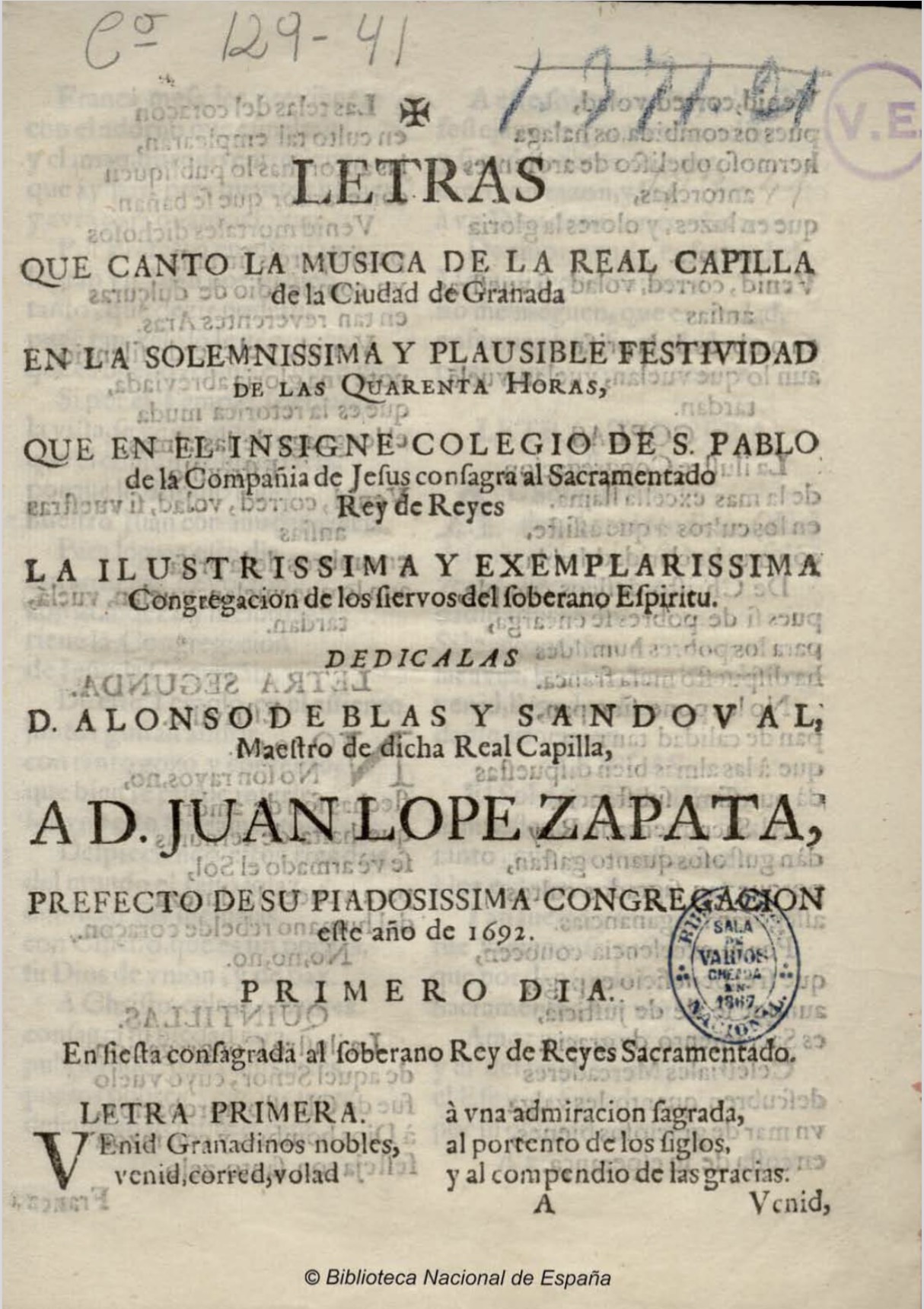 También contamos con las letras de los villancicos que la capilla de música de la Capilla Real cantó en la iglesia de San Pablo, en 1695, durante esos tres días. El compositor de la música fue el maestro de capilla Alonso de Blas y Sandoval.