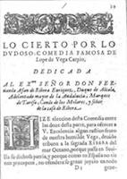 Lo cierto por lo dudoso: comedia famosa, en Parte veinte de las comedias de Lope de Vega Carpio (Madrid, Viuda de Alonso Martín, a costa de Alonso Pérez, 1625)