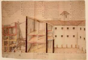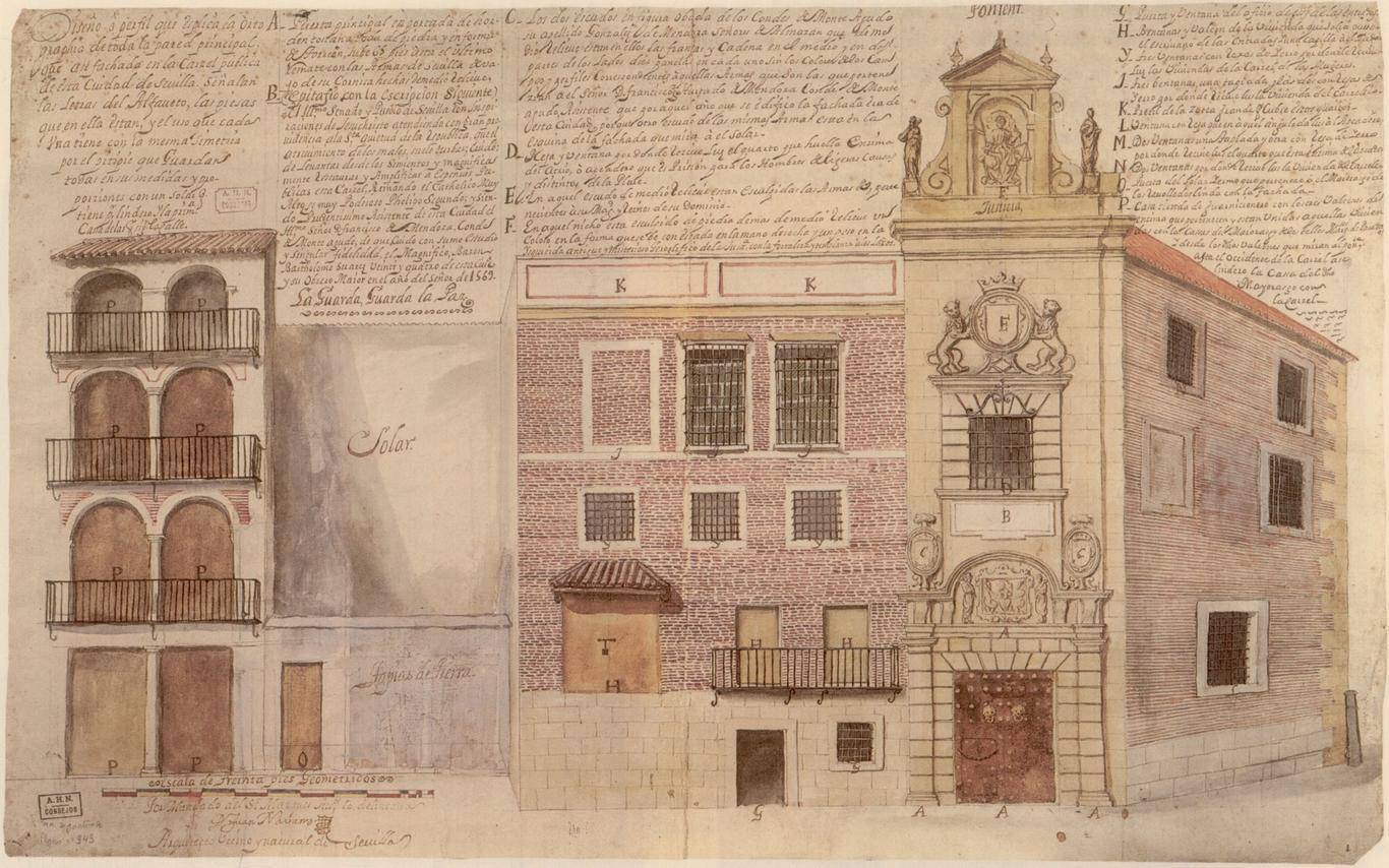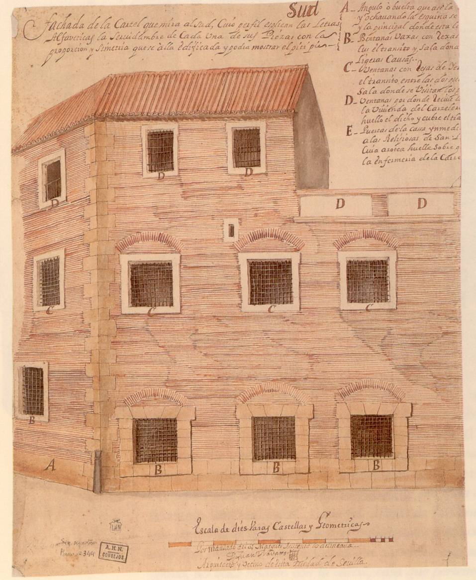 El procurador o abogado de la Audiencia Cristóbal de Chaves, en su Relación de las cosas de las cárcel de Sevilla y su trato, escrita entre 1585-1597, nos proporciona también testimonio de los sones de la música popular que tenían lugar en la prisión de mujeres, separada de la de los hombre, pero en el mismo edificio. Las presas son requebradas a través de las celosías: “cantan sus cantares germanescos desde la reja y responden ellas y por guitarra o hasta hacer el sonecillo con los grillos o con una tejoletas, o cuchillos en las rejas muy lindo… dan músicas de dentro a la reja y a ellas también no les falta su guitarra”. El jesuita Pedro de León (1544-1632) fue capellán de la Cárcel Real de Sevilla, entre 1578 y 1616, donde coincidió con Cervantes cuando estuvo preso en ella entre septiembre y diciembre de 1597, periodo en el que, según el prólogo de su obra, “engendró” El Quijote. En su Compendio de algunas experiencias en los ministerios que usa la Compañía de Jesús, terminado de redactar en 1616, nos completa la información tanto del recinto carcelario como de las mujeres que en él residían: “A la entrada de la cárcel, a mano izquierda [recursos: Diseño. Letra Y; Planta. Letra B; Demostración mitad norte. Letras C, D, E] está la cárcel de mujeres, con tres puertas de madera. Las dos son rejas. Dentro hay su patio y agua de pie, capilla y enfermería y aposento donde está la beata que las rige (si puede), si bien cuando era la que yo puse allí, que era la que convenía, muy a raya las tenía. Tienen sus muy reñidas pendencias entre sí, y andan luego a la greña... y en un punto se están ardiendo, y en otro punto se están riendo y cantando y bailando, con adufes y sonajas...”