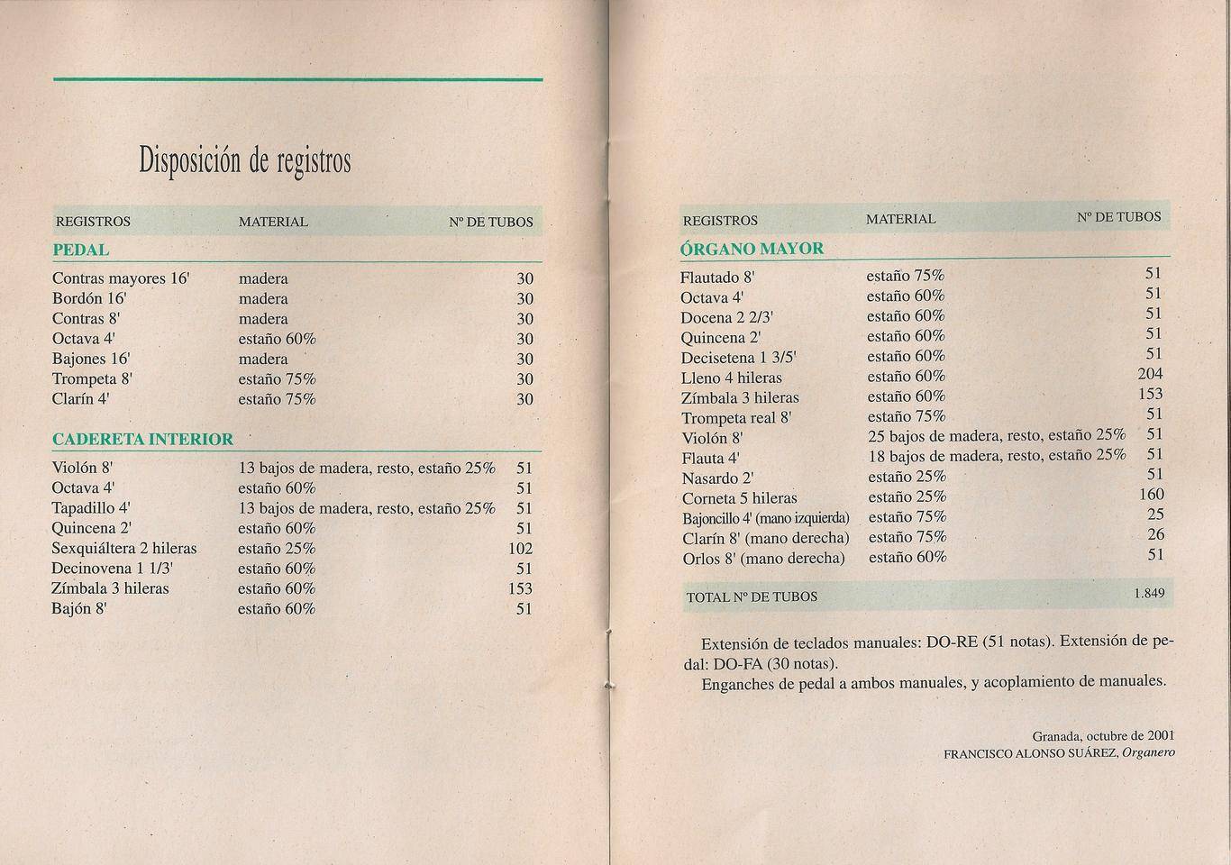 El órgano actual de la iglesia del Salvador fue inaugurado el año 2001. Su construcción estuvo a cargo del Taller de Organería de la Obra Social de la Caja General de Ahorros de Granada, integrado por el organero Francisco Alonso Suárez y su oficial José Ignacio Fernández Machado. La caja está directamente inspirada en dos órganos barrocos granadinos de principios del siglo XVII: el que todavía se conserva en el convento de San Jerónimo, procedente del convento de Santa Paula, y en la traza del órgano que construyó para la iglesia de Santa María de la Alhambra el organero Gaspar Fernández de Prado en 1619. Está compuesto por algo más de 1800 tubos. El diapasón se estableció a 440 Hz a 20º C y se optó por un temperamento igual ordinario. La presión es de 50 mm, para el órgano mayor y la cadereta, y de 60 mm para el pedal. Para la disposición de registros véase el documentos adjunto en recursos.
