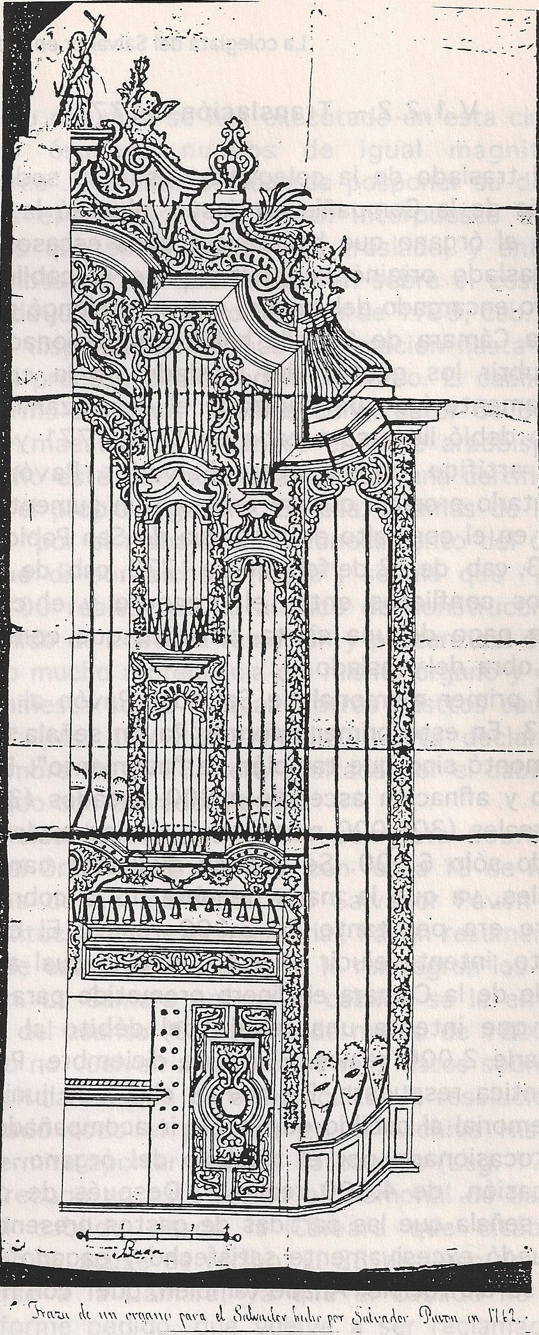 Tras los devastadores efectos del terremoto de 1755, la iniciativa de construcción de este instrumento para la colegiata del Salvador derivó de un memorial dirigido al rey Carlos III el 8 de junio de 1762, en el que se exponía, entre otras cosas, la necesidad de un nuevo órgano. Para informar del estado del órgano que había en la colegiata se llamó al organero Sebastián Pabón y Valdés, que en esa fecha tenía 30 años, el cual emitió el informe el 11 de agosto de 1762. A continuación realizaba dos propuestas de órganos acordes al tamaño de la iglesia. A estas se añadió otra tercera, elaborada por el organero fray Pedro del Sacramento, agustino descalzo, junto con su oficial Bartolomé Federico. La evaluación de estos tres proyectos se encargó al racionero organista de la catedral Fernando Vidal Polaino que igualmente tenía experiencia como organero. Después de tomar en consideración todos los informes, la Cámara de Castilla dará luz verde a la construcción de uno de los proyectos de Sebastián Pabón el 12 de abril de 1763. El instrumento se escrituró en 27.000 reales, constaba de dos teclados de 45 teclas y debía ser alimentado por cinco fuelles. La composición del instrumento era la siguiente: