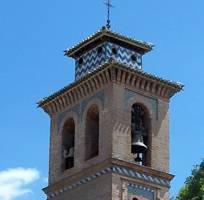 La torre mudéjar, adosada por el lateral izquierdo a los pies de la iglesia, fue construida por el albañil Juan Castellar entre 1561 y 1563. El campanario presenta seis arcos, dos en los laterales más anchos y uno en los frontales. Los arcos peraltados sobre pequeñas ménsulas tienen las albanegas de cerámica sevillana. El campanario actualmente tiene cuatro campanas. En el arco central del muro de la torre, orientado hacia el noroeste, se encuentra colocada una campana anónima del siglo XV con la inscripción latina “IC EST SANTE ANNE”, posiblemente en alusión a la nueva iglesia de Santa Ana ubicada sobre la antigua mezquita Almanzora. Hay otras dos campanas que como la anterior son anónimas, dedicadas a Santa María Magdalena y a San Antonio Abad (más conocida como la Escobacha). La cuarta, de San Joaquín, está fechada en 1771 y ha sido atribuida al campanero granadino José Corona.
