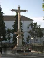“Donde los vestimentos se venden para una grande parte de la ciudad; mira a el Oriente y Mediodía en medio de cinco entradas de calles que las tres son principales y las dos no tanto, si bien una de ella da subida al monasterio de monjas de Sancta Catalina de Sena que le está a cavallero [a mayor altura o desde ella]. Tiene asiento en medio desta plaza una corpulenta y maravillosa cruz de piedra parda y blanca que a costa de la devoción de sus vecinos devotos fue puesta cercándola con reja de bronce, con cuatro faroles en sus cuatro esquinas que lucen noche y día, a cuya devoción dedican grandes fiestas por el mes de mayo con salve los festivos días, a cuya imitación se han puesto otras que pondré en su lugar”.