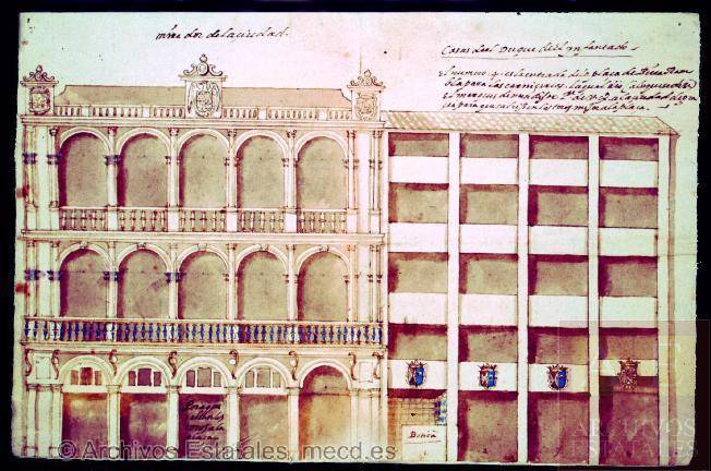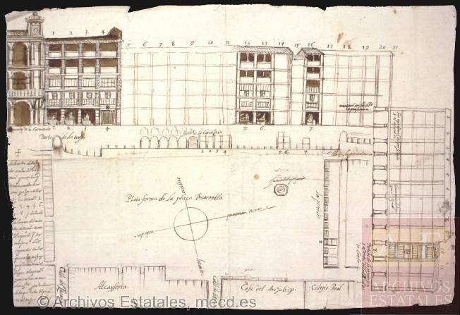 La plaza de Bibarrambla se encontraba limitada, como se puede apreciar en la plataforma de Ambrosio de Vico, por la muralla que venía a la puerta real, paralela a la calle Mesones y con entrada por la puerta de las Orejas, que todavía se conservaba en el siglo XIX, y por el arco de las Cucharas de la casa de los Miradores, construida en 1556. Ya en época árabe fue escenario de justas y festejos. Desde la conquista se siguió un proyecto de ampliación y remodelación que se prolongó durante buena parte del siglo XVI. Bermúdez de Pedraza, a principios del siglo XVII, la describe como la plaza principal de la población y escenario de todas las fiestas, civiles y religiosas, entre ellas, muy especialmente, las famosas del Corpus Christi. Para presenciar tales festejos, distintas instituciones y corporaciones tenían sus propios miradores: el cabildo de la ciudad, el de la catedral (casa del arzobispo), la inquisición, “presidente y el acuerdo” (chancillería), así como los de la “provincia y asientos de los alcaldes de cortes”. En la “traza del plano de situación y alzado de las casas y tiendas de la plaza de Bibarrambla” que se ha datado en 1616 y que se encuentra en un legajo con documentación correspondiente al ducado del Infantado (ver recurso), puede apreciarse la localización de estos miradores, entre ellos también los de las casas que poseía el duque, al lado de la casa de los Miradores, en las que estaban sus escudos de armas. El documento especifica: “las tiendas dibujadas son las del duque nuestro señor, que son las que tienen escudos de armas y al pie dellas hay los números 1, 2, 3, 4, 5, 6, 7 y 8 de las de la acera del mirador de la ciudad, toma el acuerdo para sus mujeres. Los segundos son los que son los mejores porque los andamios llegan a los primeros y así se están con más los segundos y en la acera de los portales el primero es el mejor de todos”. Otros miradores pertenecían a particulares, los cuales los alquilaban a precios abusivos cuando se celebraba alguna fiesta destacada. En 1566, se discute en el cabildo municipal sobre este asunto y se decide fijar los precios de ese alquiler: “Trataron de los precios excesivos que piden y llevan las personas que tienen ventanas en la plaza Bibrrambla para alquilar para las fiestas que se han mandado hacer ahora, y como piden por un suelo diez ducados, acordaron que los que tienen suelo que alquilar en la plaza Bibrrambla para estas fiestas en la acera de los Portales y la acera de las Carnicerías lleven por el primero y segundo suelo cuatro ducados por cada uno, y por los otros suelos lleven aquello que tasaron los señores por cada uno los señores justicia y diputados, siendo de allí abajo, y más so pena de cada mil maravedíes repartidos conforme a las ordenanzas de esta ciudad y mandaron que se pregone...”.