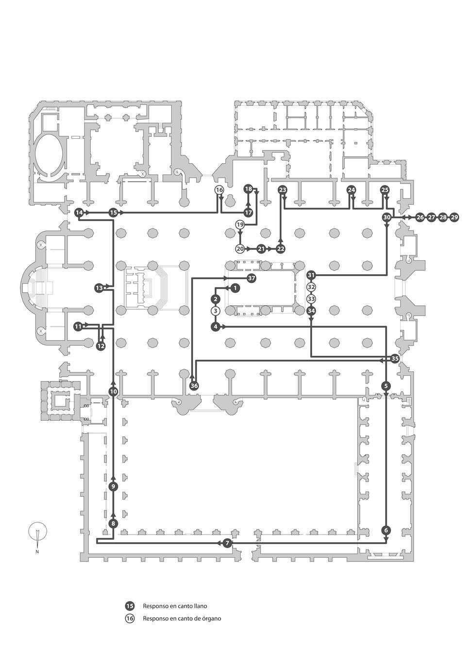 Tras la misa de tercia, se iniciaba la procesión, en la que se interpretaban una serie de responsos que coinciden con los de los Maitines del Oficio de difuntos. Las melodías con las que se cantan estos responsos son variantes de las versiones romanas, con excepción del Requiem eternam que no se encuentra en el oficio romano. Se ha podido reconstruir, con bastante precisión, el itinerario que recorría la procesión de difuntos en la catedral de Sevilla en el siglo XVII (véase recurso). En las 37 estaciones que hacía esta procesión, se cantaban responsos en canto llano o polifónicamente. Todo apunta a que fueran el Ne recorderis y el Libera me Domine de morte eterna, ya que estos son los que, al menos desde el siglo XIV, se prescribían en los aniversarios después de la vigilia y de la misa. El Compendio de las obligaciones que deben cumplir los ministriles y capilla de música ya hace alusión siempre, y en exclusiva, al Ne recorderis como el responso cantando polifónicamente en los aniversarios, citando solo la interpretación polifónica del Libera me Domine, “cantado por el libro”, al final de la misa. La catedral contó en su Librería de música con las versiones polifónicas más antiguas conservadas de estos responsos. El Ne recorderis de Francisco de la Torre y el Libera me Domine de Juan de Anchieta, ambas a cuatro voces. La idiosincrasia y despliegue de medios llevados a cabo en esta procesión le concede un carácter único en el conjunto de las 211 procesiones que anualmente circulaban por el interior de la catedral de Sevilla a principios del siglo XVIII.