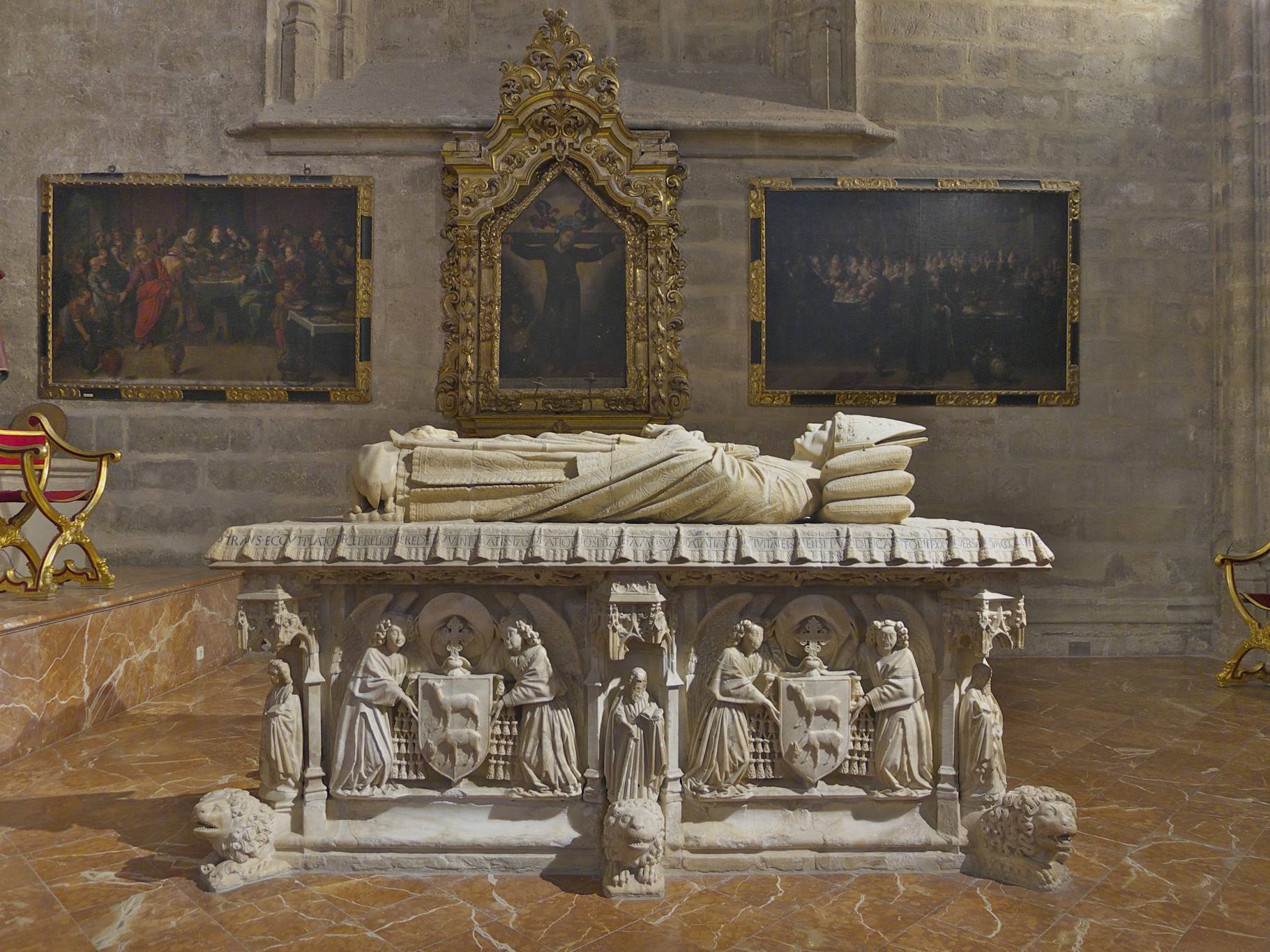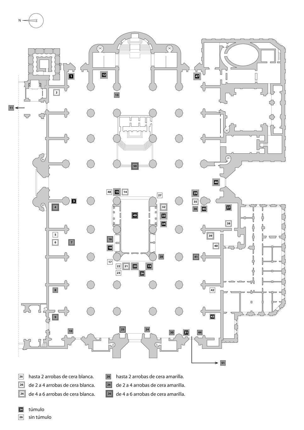 La procesión del día de difuntos es uno de los eventos más destacados del ritual asociado a las festividades Omnium sanctorum y Commemoratio omnium fidelium defunctorum, entre las que existe una evidente conexión teológica y un tratamiento litúrgico unificado. Esta procesión ejerció un fuerte impacto emocional sobre la ciudadanía y denota la influencia que en ella tuvo la doctrina de la Fe relativa al Purgatorio, traducida en el progresivo incremento de dotaciones particulares que fue acumulando con el paso del tiempo. El recorrido de esta procesión en la catedral hispalense sufrió alteraciones paralelas a las modificaciones espaciales que tuvieron lugar entre sus muros, especialmente drásticas como consecuencia de la construcción del templo gótico en la segunda mitad del siglo XV. La vertiente sensorial de esta procesión es muy compleja. El día de difuntos, el altar mayor estaba cubierto con sus cortinas y se colocaba el frontal negro, “rico”. En este espacio se ponía una alfombra grande y se disponían blandones grandes y pequeños y cuatro candeleros, con cera amarilla. En las escaleras del altar se colocaban 154 hachuelas amarillas “de a libra”. Especialmente destacable es la “decoración” de las tumbas con paños, cirios, cruces, etc. que reflejan el status social del fallecido (véase recurso), así como el vestuario del cortejo que desfila en un espacio provisto de una iluminación que concede un carácter identitario a esta procesión. El particular efecto odorífico y psicoactivo del incienso y el del característico olor de la cera al arder constituirían los principales elementos olfativos que se fusionan para favorecer su clima espiritual. El elemento sónico es particularmente relevante y diverso. El día de difuntos se tañía 24 horas seguidas, las cuales comenzaban la jornada anterior, al iniciarse las Vísperas, y finalizaban al concluir los oficios de las cuatro horas que se celebraban por la mañana. Se doblaba con todas las campanas de golpe, sin que se usaran ese día los esquilones, siguiendo una secuenciación repetida que, en esencia, constaba de cuatro secciones:
