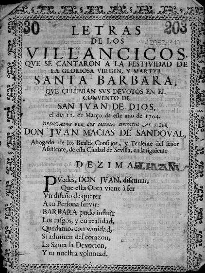 Se han conservado los textos de los villancicos que se cantaron “a la festividad de… Santa Bárbara que celebran sus devotos en el convento de San Juan de Dios el día 11 de março de este año de 1704”. Están dedicados a Juan Macías de Sandoval, “abogado de los reales consejos y teniente del señor asistente de esta ciudad de Sevilla”. Resulta sorprendente la fecha, ya que la festividad de Santa Bárbara se celebraba en el calendario litúrgico el 4 de diciembre. Posiblemente se trate de un evento anual, pero desconocemos la cronología de esta fiesta y durante cuánto tiempo fue objeto de villancicos expresamente compuestos para la ocasión. El hospital de Nuestra Señora de la Paz fue donado a la orden de San Juan de Dios en 1574, con ampliación de su fundación en 1588.
