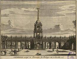 El 28 de septiembre de 1598, el cabildo de la ciudad hispalense recibía la comunicación oficial del fallecimiento del rey Felipe II (acontecido el 13 de septiembre, en el monasterio de El Escorial) para que comenzara a preparar las ceremonias acostumbradas, ordenándose el pregón que habitualmente se hacía con trompetas y atabales y la fabricación del túmulo, al tiempo que se prohibían: “todos los actos de alegría comunes y ordinarios, cuales suelen ser música, bailes, danzas y otros semejantes regocijos”. Se conocen varias relaciones del megalómano túmulo y de las exequias celebradas en la catedral de Sevilla al fallecimiento del monarca, así como una imagen del mismo. Ese dibujo, Catafalco erigé à l’honner de Philippe III [sic] à Seville, procede de un libro de viajes impreso en Ámsterdam, en 1741, el cual debió ejecutarse a partir de la “estampa” realizada por Diego López Bueno, impresa a instancias del cabildo municipal en 1598. El monumento funerario comenzó a construirse el 1 de octubre, como era habitual en el espacio “entre los dos coros”, en el crucero de la catedral. Esta colosal estructura, trufada de esculturas, pinturas y poemas, fue iluminada con una descomunal cantidad de cera proporcional a sus dimensiones, quinientas setenta y cinco arrobas y ocho libras, creando un intenso efecto magnético sobre toda la ciudadanía que acudía en masa para visitarlo. El licenciado Francisco Gerónimo Collado, c. 1610, escribe una pormenorizada descripción de ese túmulo en la que da cuenta de los epigramas que se colocaron en él, cuyo autor fue el canónigo de la catedral Francisco Pacheco, así como de sus numerosos elementos arquitectónicos, pictóricos y escultóricos a cargo, entre otros, de Juan de Oviedo, Francisco Pacheco, el joven, y Juan Martínez Montañés. Las exequias debían celebrarse el 24 y 25 de noviembre, pero debido a una disputa entre el cabildo catedralicio y la Inquisición tuvieron lugar los días 30 y 31 de diciembre, con lo cual el túmulo funerario estuvo expuesto para su contemplación durante mucho más tiempo de lo que era habitual.