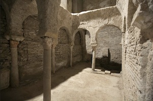 En la calle Real de Bab al-Fajjārīn (actual Santa Escolástica) se encontraba la mezquita Ibn Gimara, en la que se consagró una parroquia en una fecha que no ha podido precisarse y que no aparece en la erección general de 1501. Antes de 1521 debía estar ya dedicada a Santa Escolástica. En 1521, este edificio pasó a formar parte del conjunto de la casa de los Tiros y la parroquial se trasladaría a una nueva edificación muy próxima a ella. Con frecuencia existe una conexión entre los aljibes y las mezquitas granadinas, situándose muy próximos a ellas, ya que de estas cisternas se obtenía el agua para el consumo y para las abluciones rituales. Se han asociado con la mezquita Ibn Gimara los baños existentes en el palacio del marqués de Villa Alegre (actualmente colegio de las Mercedarias).