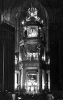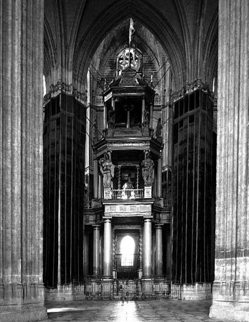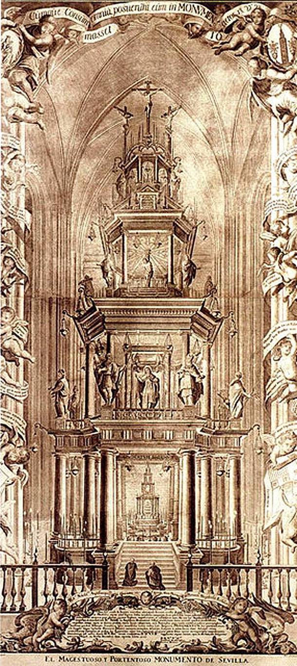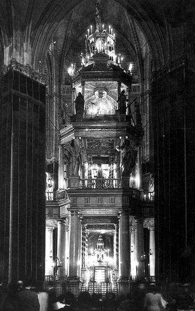 [1630]... Acabada de cantar la Profecía... y al ínterin el coro está cantando este segundo tracto despacio; mientras, los tres cantores que han de cantar la Pasión estarán vistiéndose en la sacristía con hábito diaconal, sin planetas, con estolas negras atravesadas. Los peones habrán puesto a la puerta de la capilla mayor el tablado pequeño, para el que ha de hacer la persona de el Cristo, cubriendo el tablado con un tapete y puesto en él atril, como suele. Saldrán los tres de la sacristía, los que han de cantar la Pasión, el primero el que hace el Evangelista y el segundo el significa a las personas particulares y el último el que hace la persona de Cristo, y todos tres harán genuflexión hacia el Monumento y reverencia a el altar y al Prelado, no llegando a besarle la mano. Llevará cada uno su libro cerrado sobre el brazo izquierdo, subirán cada uno a el lugar donde han de cantar, estando cubiertos, y habiendo dejado de cantar el tracto el coro, comenzará el Evangelista el texto de la Pasión de Sanct Juan, diciendo cada uno por su orden lo que le pertenece, y los músicos, en el coro, harán las responsiones que pertenecen a la turba; a el ínterin, el Prelado, apartada la silla y sin mitra, en pie, en el propio altar, a el lado de la epístola, leerá toda la Pasión, menos el texto que después se cantará por evangelio. Y acabada de leer la Pasión, estará vuelto un poco hacia el que canta el texto, hasta que acabe de cantar la Pasión... cerca del fin de la Pasión habrán venido de el coro dos canónigos, que de estos hubieren encargado, y dos veinteneros con el maestro de ceremonias y un pertiguero, por el postigo de la sacristía, subirán a ella y habiendo acabado la Pasión, quitadas las capas los dos canónigos, se descalzarán de el todo, o por lo menos en plantillas, de que habrán venido apercibidos, esperarán al maestro de ceremonias para lo que han de hacer en el ínterin, pues que cerca de el fin de la Pasión se canta el Inclinato capite tradidit spiritum, los que dicen la Pasión hacen pausa y se hincan de rodillas hacia el Monumento, y el Prelado, también con los demás, juntas las manos por un breve tiempo, cuanto un Pater noster, y levantado el prelado y todos prosiguen el texto de la pasión hasta el fin, y el prelado dice Munda cor meum sin ir a el medio del altar...”