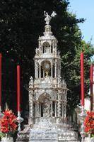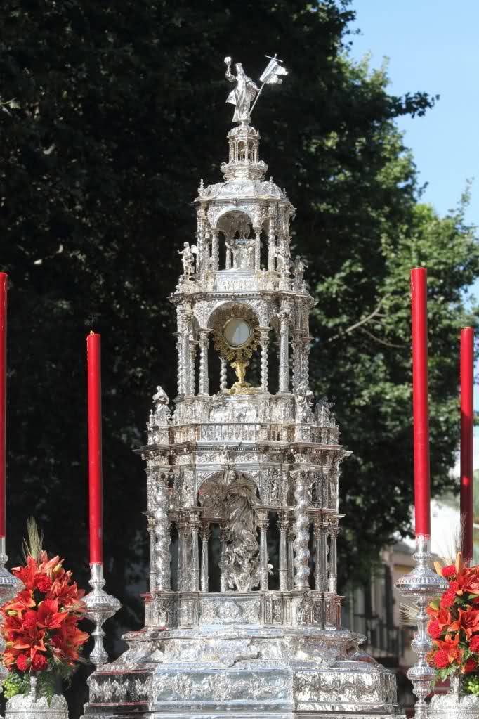 Su actual custodia fue producto de un dilatado proceso de labrado iniciado en 1678 por Diego de León, maestro platero cordobés afincado en Sevilla.