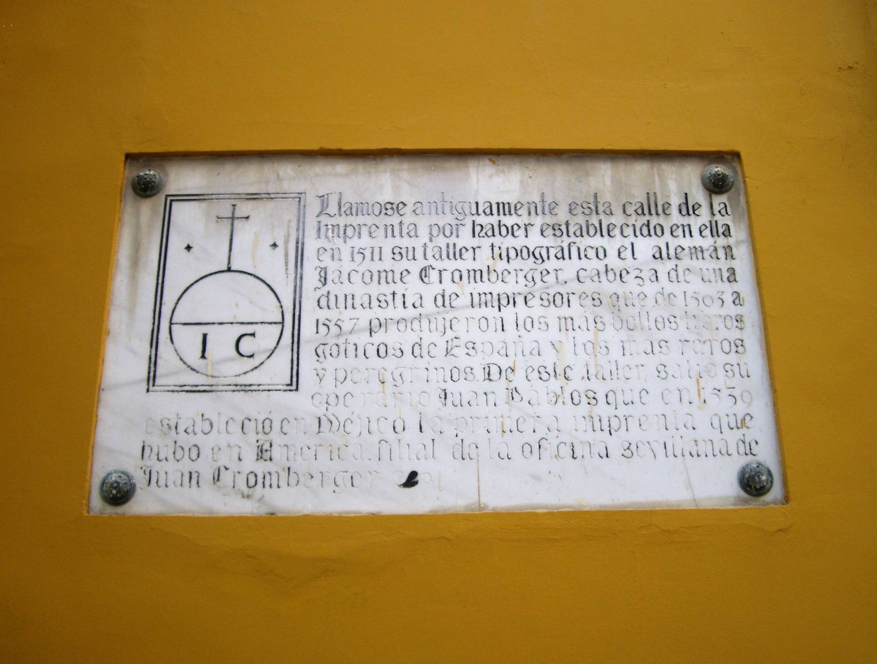 La ciudad de Sevilla contó con un taller de impresión desde la década de 1470. En 1511 el tipógrafo alemán Jacome Cromberger estableció su taller en la que sería conocida como calle del Imprimidor o de la Imprenta (actual calle Pajaritos). A la muerte de Jacome, en 1528, continuo con el taller su hijo Juan, fallecido en 1540. En esa fecha, el taller contaba entre sus trabajadores con cinco esclavos “tres negros que eran batidores, y un negro y un esclavo blanco [posiblemente árabe] que trabajaban como tiradores, lo cual nos da idea del potencial impresor del taller. En 1539, uno de los oficiales del mismo, Juan Pablos, estableció en México la primera imprenta en América, filiar de la oficina hispalense, para cuya hazaña se llevó a un ayudante, Gil Barbero y un esclavo negro llamado Pedro. Libros de diferente naturaleza, pliegos sueltos, certificados, indulgencias fueron impresos en cantidades ingentes. En 1528, en la tienda de Jacome había 50.500 “pliegos de coplas”, 21.000 “pliegos de oraciones”, más de 10.000 “pliegos de imágenes” y 3.000 de “Rosario de Nuestra Señora”, cantidades menores de cartillas y “artes de canto llano”. Entre 1529 y 1540 imprimieron el 55% de las ediciones hechas en la ciudad. Seleccionamos algunos títulos que nos parecen especialmente relevantes para nuestra plataforma. Tuvieron el monopolio de las ediciones litúrgicas del arzobispado de Sevilla y de su taller salieron, por ejemplo, la bellísima edición del Missale secundum usum alme ecclesie hispalensis (1507), impreso en vitela a dos columnas, en letra gótica y a dos tintas roja y negra, incluye una iluminación de un Calvario, a página completa, y una muy elaboradas orlas y capitales iluminadas. En 1512 vendió 2.000 “cartillas de enseñar a leer” a una expedición franciscana que se dirigía a Indias para evangelizar a los indios caribeños. En un inventario de 1529 se da cuenta de 1.038 “cuartillas del arte (cada ejemplar valía 2 maravedís), 2.355 “artecicas de cante llano” (a 1,96 maravedís la unidad) y 324 “artes de canto de la mano” (a 6,25 la unidad). Entre las “artes de canto llano”, Jacobo imprime un Arte de canto llano (c. 1512-1515?), anónimo, y en 1518, una edición del tratado de Marcos Durán Lux bella de canto llano, y su hijo Juan, en 1530, una edición del tratado Arte de canto llano de Juan Martínez, maestro de los mozos de coro de la catedral de Sevilla. En un inventario de Juan Cromberger (1540) se listan 1150 “artes de canto llano de a dos pli[e]gos”, 600 “artes de la mano”, 375 “artes de canto negros”, 63 “arte de la mano”, 137 “libretes llanos” y 13 “artes de canto llano contrapu[n]tadas”. Los sonidos del funcionamiento de los tórculos y las herramientas para la impresión y encuadernación de este taller se constituirían en uno de los principales soundmarks de esta céntrica calle sevillana.