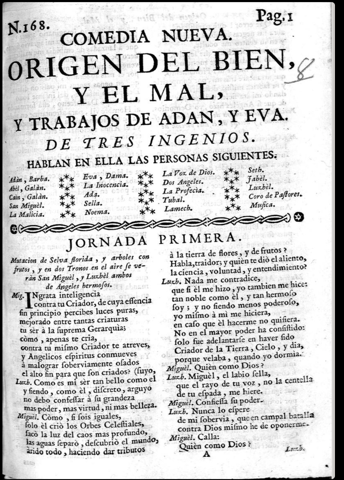 Existe una edición impresa de La comedia nueva Origen del bien y el mal y trabajos de Adán y Eva de tres ingenios (Valencia, Imprenta de José y Tomás de Ortega, 1771). Uno de los personajes, como es habitual, es “la Música”, la cual tiene numerosas intervenciones. Otros personajes también cantan a solo, alternando con ella. En la segunda jornada, se escenifica el portal de Belén y “salen cantando y bailando los pastores y pastoras con sonajas y panderos” un villancico; al final de esa jornada se representa la bóveda celeste en la que cantan dos ángeles. La tercera jornada se abre y cierra también con escenas musicales, además de intercalar otra en la que Tubal tañe flauta y tamboril.