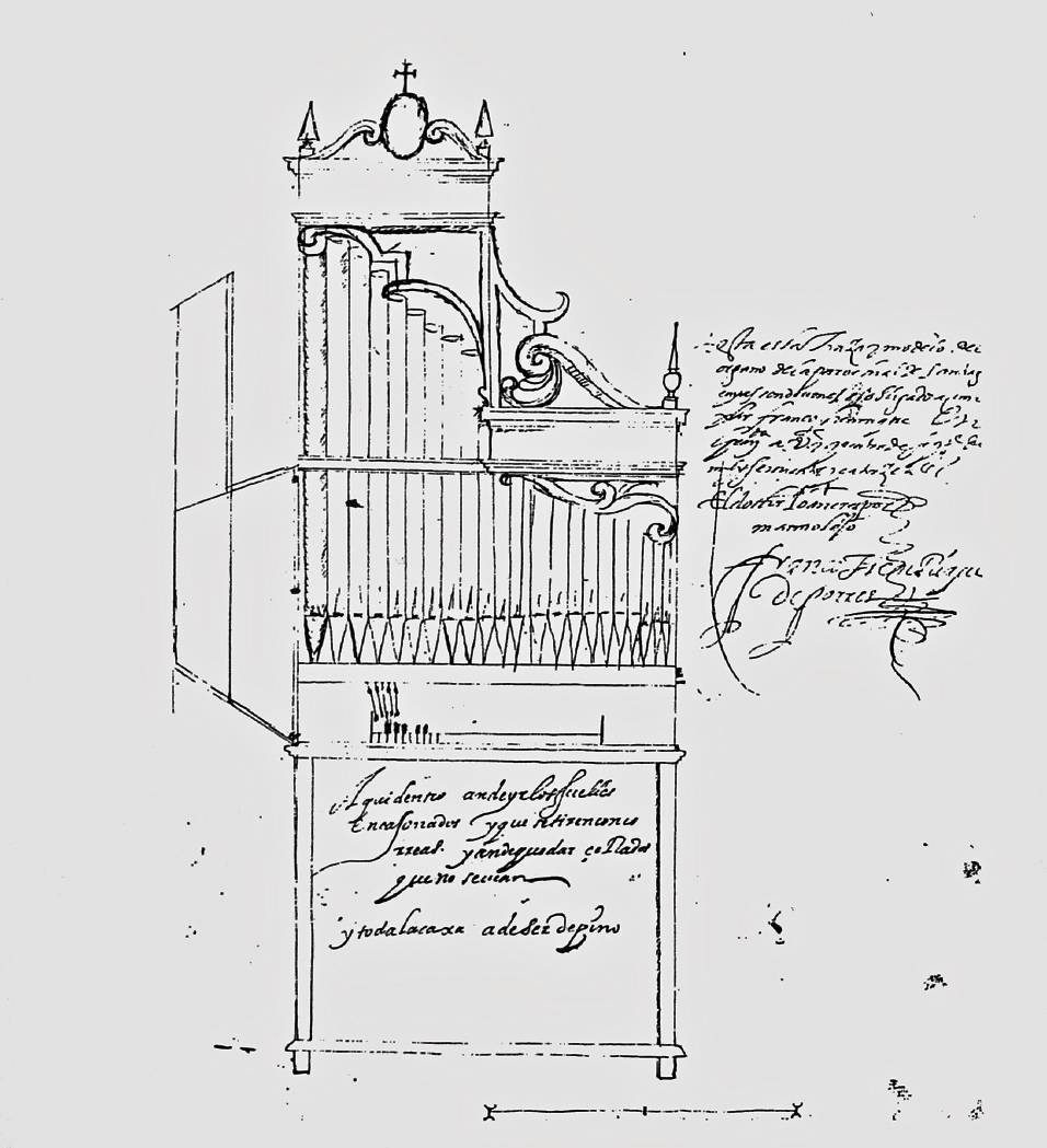 - Hase de haçer la caja toda nueva y de esta traça [ver recurso] y todo de pino y los fuelles se han de encajonar que no se vean porque estén más guardados y que se tiren con unas correas. Esta caja ha de tener cerca de cuatro varas de alto con pie y remates y vara y media poco menos de ancho lo que pidiere la proporción.
