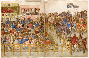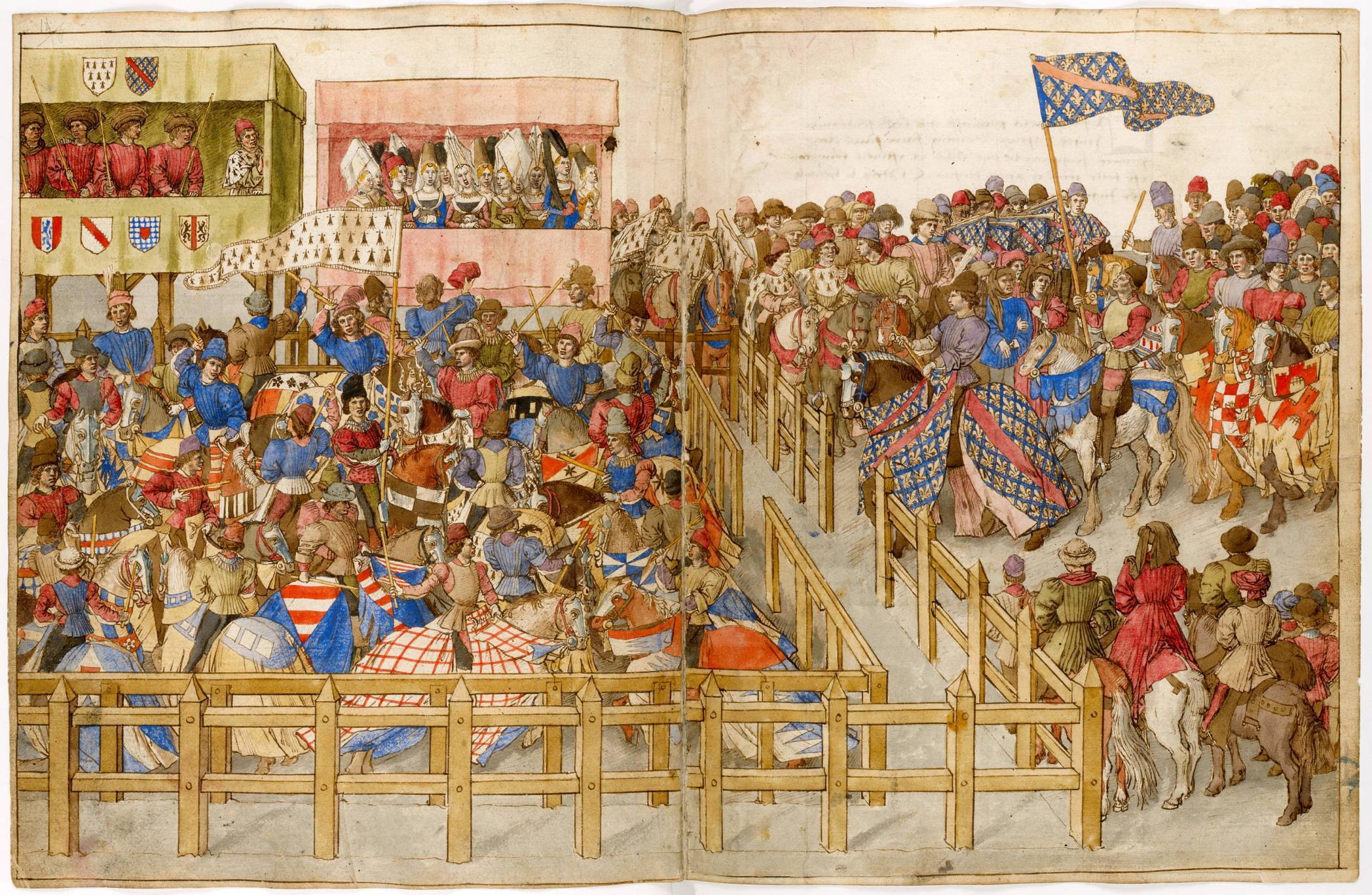 Las gradas de la catedral y las plazas del Alcázar y de San Francisco fueron los principales escenarios para los juegos ecuestres desde mediados del siglo XIV. En las navidades de 1375, el rey Enrique II organizó en Sevilla, según el cronista Diego Ortiz de Zúñiga: “un famoso torneo, en que lucieron mucho los caballeros de la banda que aunque habían decaído algo de su instituto quería fomentarla por obra de el rey don Alonso, su padre”. Alfonso XI había instituido en 1332 la Orden de la Banda que puede considerarse como la órden de caballería bajomedieval más antigua. Conectadas directamente con ella estaban las ordenanzas de los torneos y justas que hizo el rey Alfonso XI cuando instituyó la citada orden. Existen numerosas copias del Libro de la Orden [de la Banda], siendo una de las más antiguas y completas la que se conserva en la Biblioteca del Monasterio del Escorial, sig. Z-II-14, fols. 95/80-107/192 (doble numeración). En la Biblioteca Nacional hay varias copias, la más temprana del siglo XVII, donde están incorporadas también las citadas ordenanzas (Mss. , fols. 42v-43r, ver recurso).