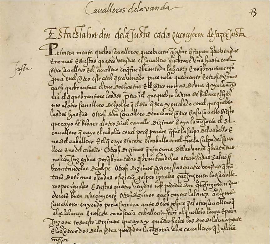 Primeramente decimos que los caballeros que hubieren a justar que fagan cuatro venidas e non más, e si en estas cuatro venidas el un caballero quebrantare un asta en el otro caballero, e el caballero en que fue quebrada el asta non quebrantare ninguna en el otro, este atal que sea vençido pues la non quebró. E otrosí decimos que si quebrare el uno dos astas e el otro no más de una que haya la mejoría el que quebró las dos; pero si el que quebró la una derribare el yelmo al otro caballero del golpe que le dio, que sea igualado con el que quebró las dos astas. E otrosí, si un caballero quebrare dos astas en otro caballero e el otro caballero en quien las quebró derribare a él, aunque non le quiebre el asta, decinmos que este atal que sea igualada con el que quebró las astas. E otrosí si un caballero derribare a otro e a su caballo, si este que cayó derribara al otro sin el caballo, decimos que haya la mejoría el caballero que cayó el caballo con él, porque paresçe que fue la culpa del caballo e non del caballero, e el que cayó sin caer el caballo con él fue la culpa del caballero e non del caballo. E otrosí decimos que ninguna de las varas quebradas no sean juzgadas por quebradas quebrándolas atravesadas, salvo quebrandolas de golpe. Otrosí decimos que si en estas cuatro venidas quebrantaren dos varas o sendas e fiçieren golpes iguales, que juzguen que no hubieron buen acaeçimiento. Otro sí deçimos que si cayere la lança a algún caballero en yendo por la carrera ante de los golpes, que el otro caballero que alce la lança e non le dé, ca non sería caballería ferir al que non lleva lança. E para juzgar todo esto que haya cuatro fieles los dos de la una parte e los dos de la otra por que den la mejoría a los caballeros que justaren mejor”.