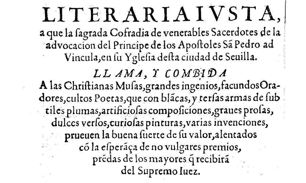 La fiesta y la justa literaria se publicaron “doce o trece días” antes de que estas diesen comienzo el 19 de junio: “habiendo convocado para su paseo atabales, trompetas de la ciudad y copia de ministriles”. Salieron el viernes, a la hora de Vísperas, desde la iglesia de San Pedro: “puestos en orden los atabales, a quien seguía el nuncio o muñidor de nuestra cofradía a caballo, con un repostero de terciopelo carmesí bordado de oro con las insignias de llaves y tiaras pontificales, dentro del cual iban gran cantidad de carteles que en diversos puestos y lugares habían de fijarse y repartirse... luego inmediatamente se seguían las trompetas de la ciudad, haciendo salva, tras ellos, algunos colegiales del colegio seminario. De aquí comenzaba el paseo de cuarenta sacerdotes venerables de nuestra cofradía, en mulas de dos en dos, interpolados con ellos algunos caballeros de capa y espada, con singular modestia y autoridad, al medio del paseo la copia de ministriles, que correspondían muy a compás y alegraban la ciudad, rematándose con tres de los dichos sacerdotes, mayordomo, secretario y consiliario de la cofradía, llevando el de en medio un guión de tela de plata con el rótulo de María concebida sin pecado original, de letras de oro, en asta también de plata... y en los dos rostros, de una y otra parte, fijados dos carteles de la justa literaria...”. La comitiva hizo una primera parada en la casa profesa de la Compañía de Jesús, “donde habiendo hecho salva la música referida”, entró el secretario de la cofradía a entregar el cartel del certamen literario al padre prepósito. De allí se fueron al colegio de San Hermenegildo, también de la Compañía de Jesús, entregando un cartel al padre rector y fijando otro en la puerta, ya que “de allí se esperaban muchos justadores”. “Fuese continuando el paseo en contorno de la ciudad, por las feriadas calles y plazas, hasta llegar a la de San Francisco”. Fijaron carteles en la Real Audiencia y en el Ayuntamiento y dieron otro al padre guardián del convento de San Francisco. Prosiguieron su camino hasta el colegio de San Miguel, dando un cartel a su catedrático y de aquí se dirigieron al colegio de Maese Rodrigo, sede de la universidad, entregando un cartel al rector y fijando otro en la puerta. De allí fueron al alcázar, donde también pusieron un cartel y, posteriormente, al palacio arzobispal. Entraron hasta el segundo patio donde fueron recibidos por el arzobispo, al que obsequiaron otro cartel. Finalmente: “fue discurriendo el paseo por diversas estaciones y conventos, dando certámenes a los superiores en la forma referida”.