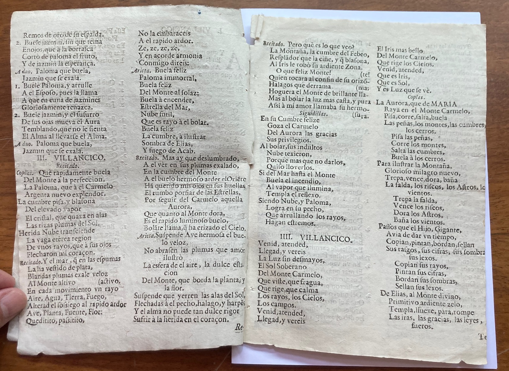 Un segundo impreso, también granadino, de 1707, salido de las prensas que Antonio López Hidalgo tenía a espaldas del hospital del Corpus Cristi, nos proporciona los textos de seis villancicos que se escribieron para la celebración de la festividad de la Virgen del Carmen ese año: