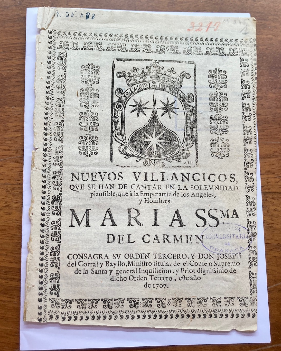 Nuevos villancicos que se han de cantar en la solemnidad plausible que a la emperatriz de los ángeles y hombres, María Santísima del Carmen consagra su orden tercero y don José del Corral y Bayllo, ministro titular de el Consejo Supremo de la Santa Inquisición y prior dignísimo de dicho orden tercero, este año de 1707: