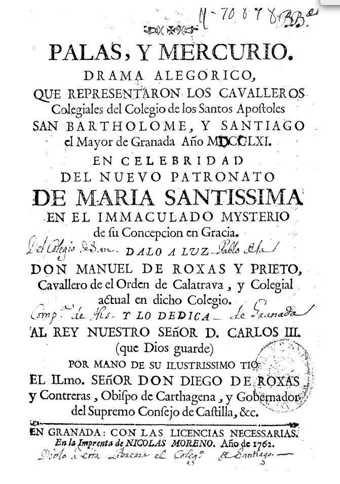 El colegio de San Bartolomé y Santiago veneraba como titular de su capilla a la Inmaculada Concepción. En la víspera de esta festividad (7 de diciembre) de 1761, el colegio celebró la concesión que el rey Carlos III había hecho, por Real Decreto de 16 de enero de ese año, del “Universal patronato de Nuestra Señora en el Misterio de su Inmaculada Concepción en todos los reinos de España e Indias”.