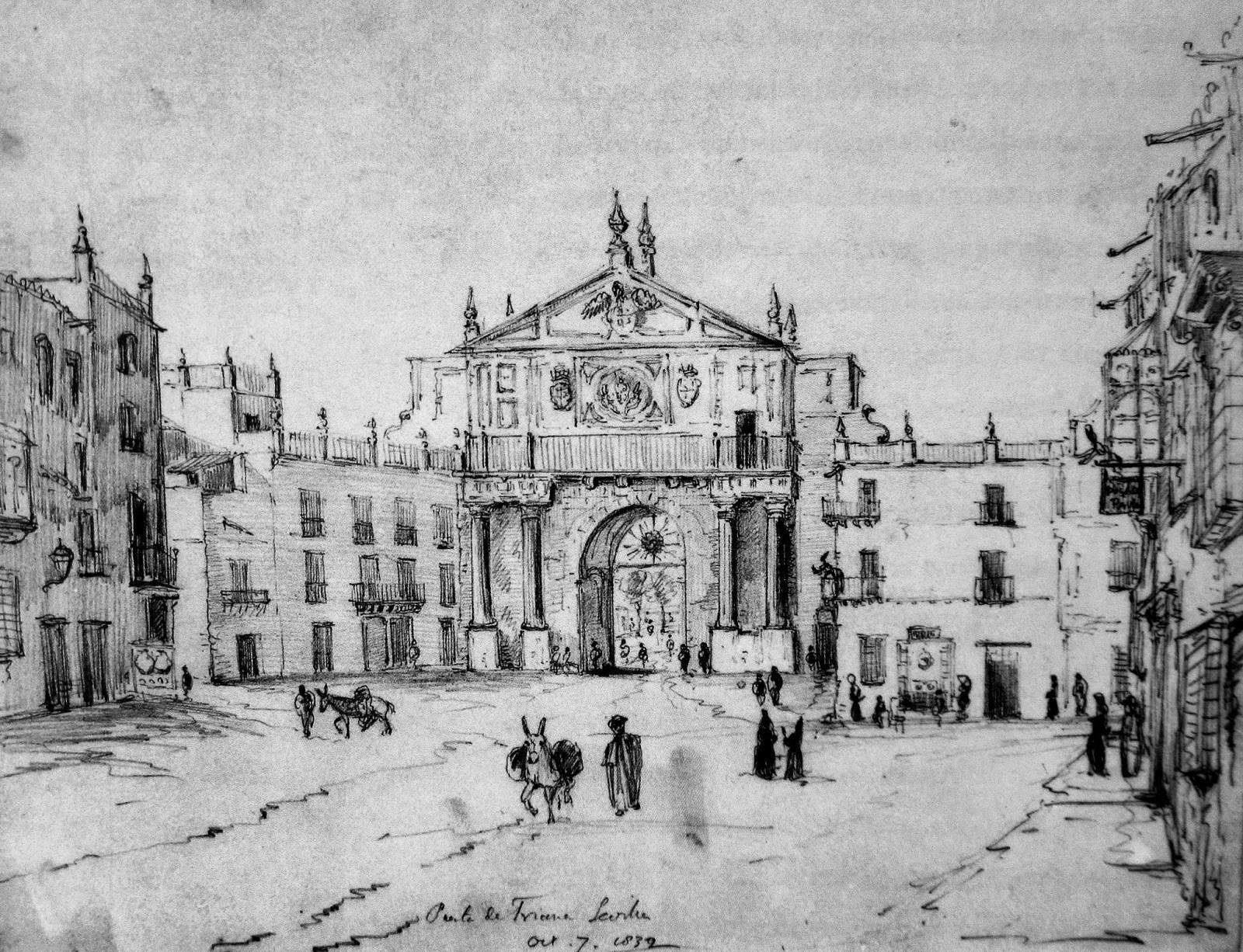 La imágenes de devoción ubicadas en distintas calles y plazas de la ciudad generaban con frecuencia la creación de hermandades que canalizaban el fervor público que solían inspirar. Este es el caso de la modesta hermandad de la Santísima Cruz de la puerta de Triana, la cual celebraba sus cabildos en el vecino convento de Nuestra Señora del Pópulo. Como otras de similar naturaleza, estas cofradías se mantenían gracias a los donativos obtenidos en las cuestaciones (“demandas”) que realizaban periódicamente los propios hermanos. El libro de cuentas que hemos localizado de esta hermandad (1765-1769) nos permite conocer algunos detalles sobre su icono devocional principal, una cruz, y sus actividades cultuales más destacadas.