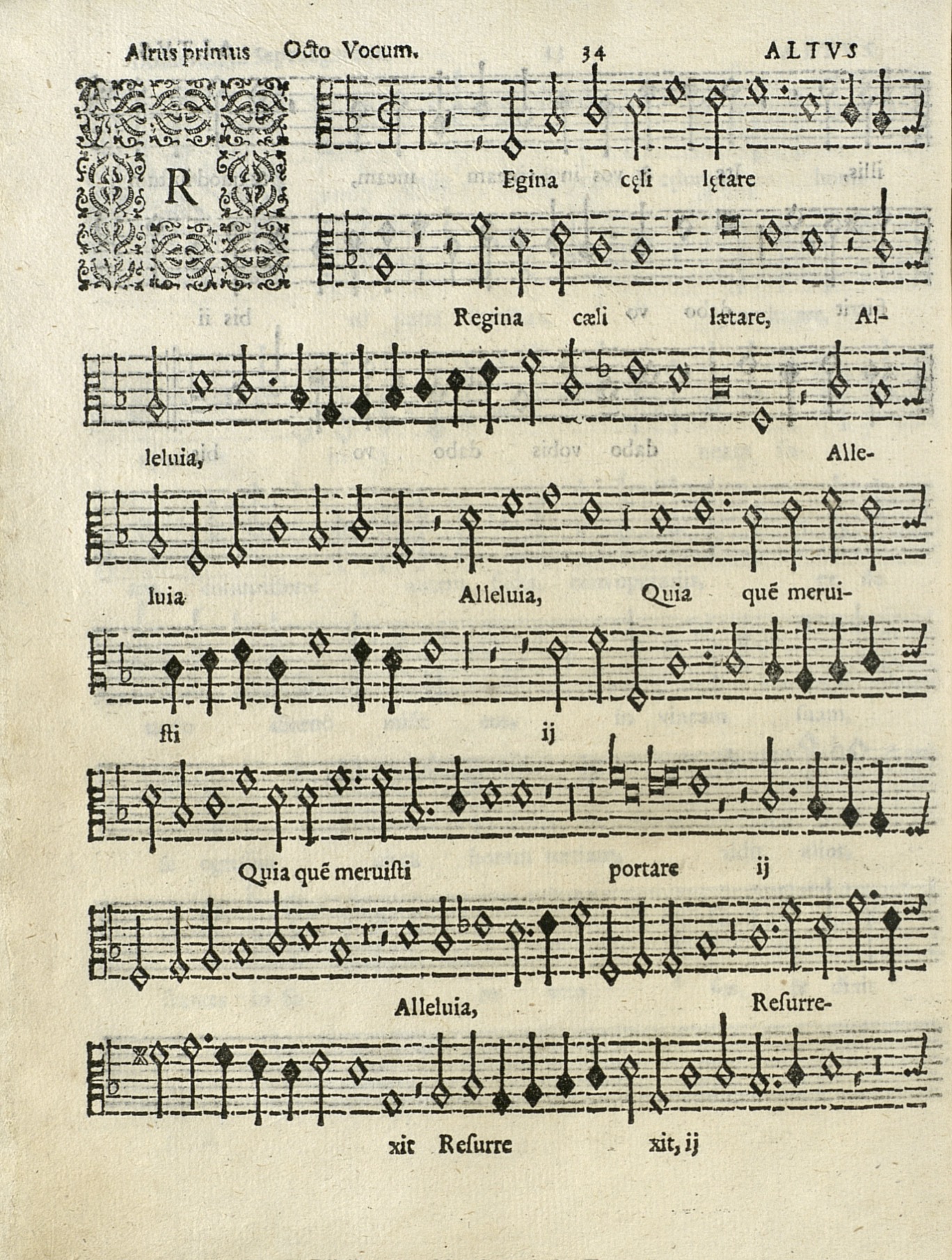En los primeros años, pudo interpretarse la versión de la antífona Regina coeli laetare del maestro de capilla de la catedral Pedro de Escobar. La primera versión de Francisco Guerrero, a cuatro voces, se conserva en el Libro de salves y motetes que se escribió para la capilla de la Antigua en 1555 [E-Sc 1]. En 1586, Guerrero recibe un libramiento de 816 maravedís: “por puntar 2 motetes, en 8 libros de canto de órgano de procesiones, nuevos que hizo, uno de la Cruz y otro de la Resurrección”. La colección de ocho libretes se había iniciado en 1560 y el motete era Regina coeli, laetare. Volvería a copiarse en la colección de libretes en pergamino Cantiones sacrae Beate Mariae dei genitricis (1587) y, posteriormente, se incorporaría en la edición veneciana de Mottecta de 1589. La capilla de música disponía también en la librería de una versión de este motete compuesta por fray Francisco de Santiago.