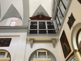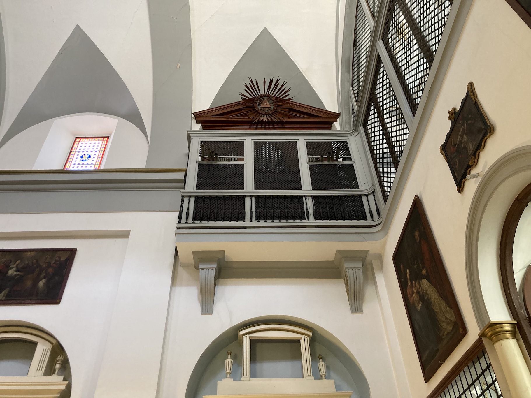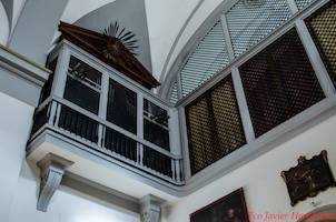 La caja, solo parcialmente visible desde la iglesia y ubicada en un lateral del coro alto, es neoclásica y está rematada con un frontón triangular en el que hay un medallón con la representación de la Santísima Trinidad. La fachada tiene tres calles, siendo la central más ancha.