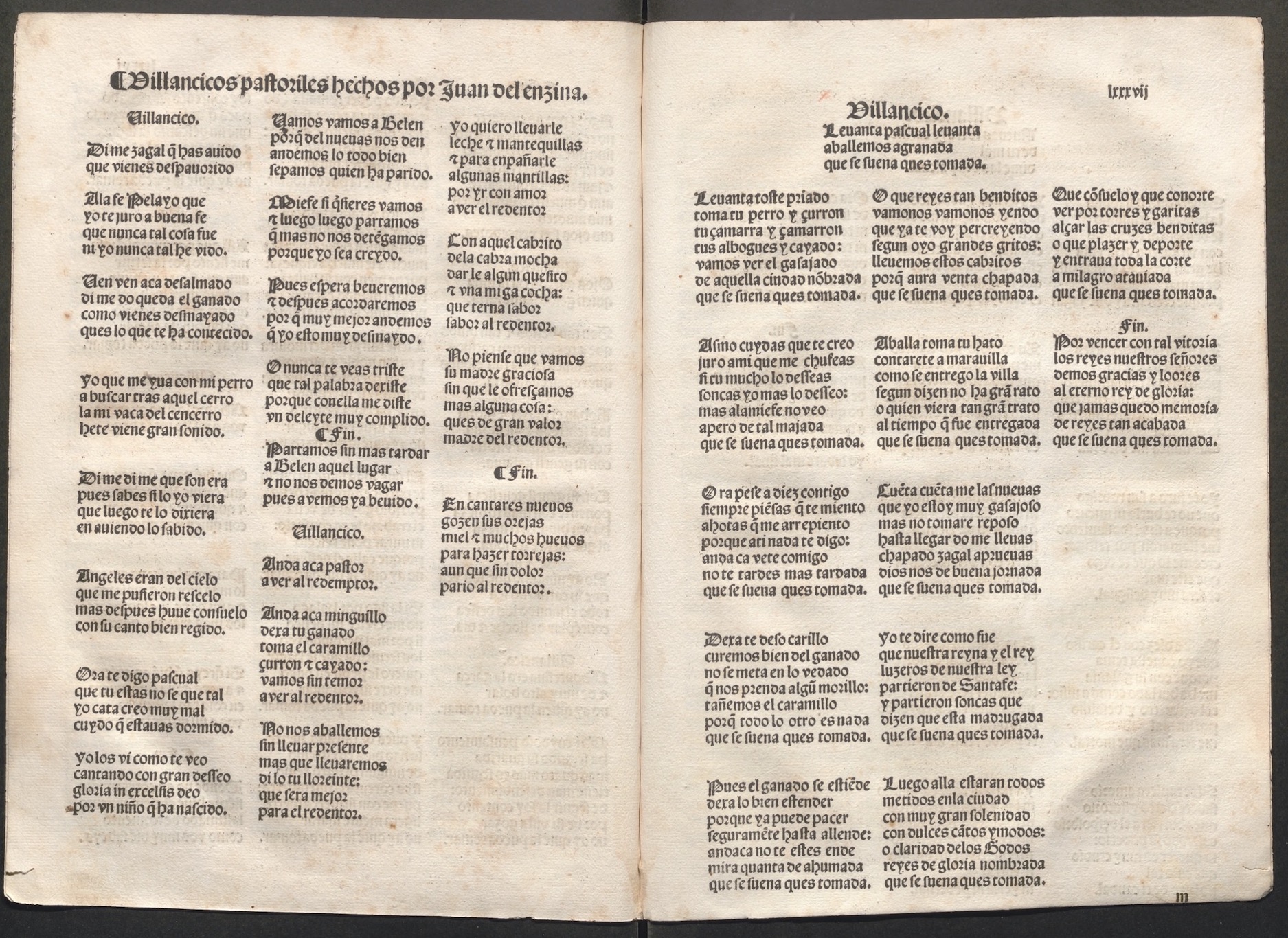 La presencia de la obra de Juan del Encina en Sevilla es muy temprana, ya que, en esta ciudad, se imprime, en 1501, la segunda edición de su Cancionero por los impresores alemanes Juanes Pegnitzer y Magno Herbst. El colofón nos informa que este post-incunable se hizo por encargo de Lázaro de Gazanis y de Guido de Leazaris, dos mercaderes de libros genoveses que llevaban ya un tiempo afincados en Sevilla y que proporcionarían el papel para su impresión, también de origen genovés. Se trata de una extraordinaria edición, en tipos góticos, de la cual solo se conservan dos ejemplares, uno completo en la Herzog August Bibliothek en Wolfenbüttel y otro mútilo en la Biblioteca Nacional de España.