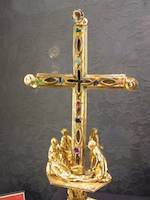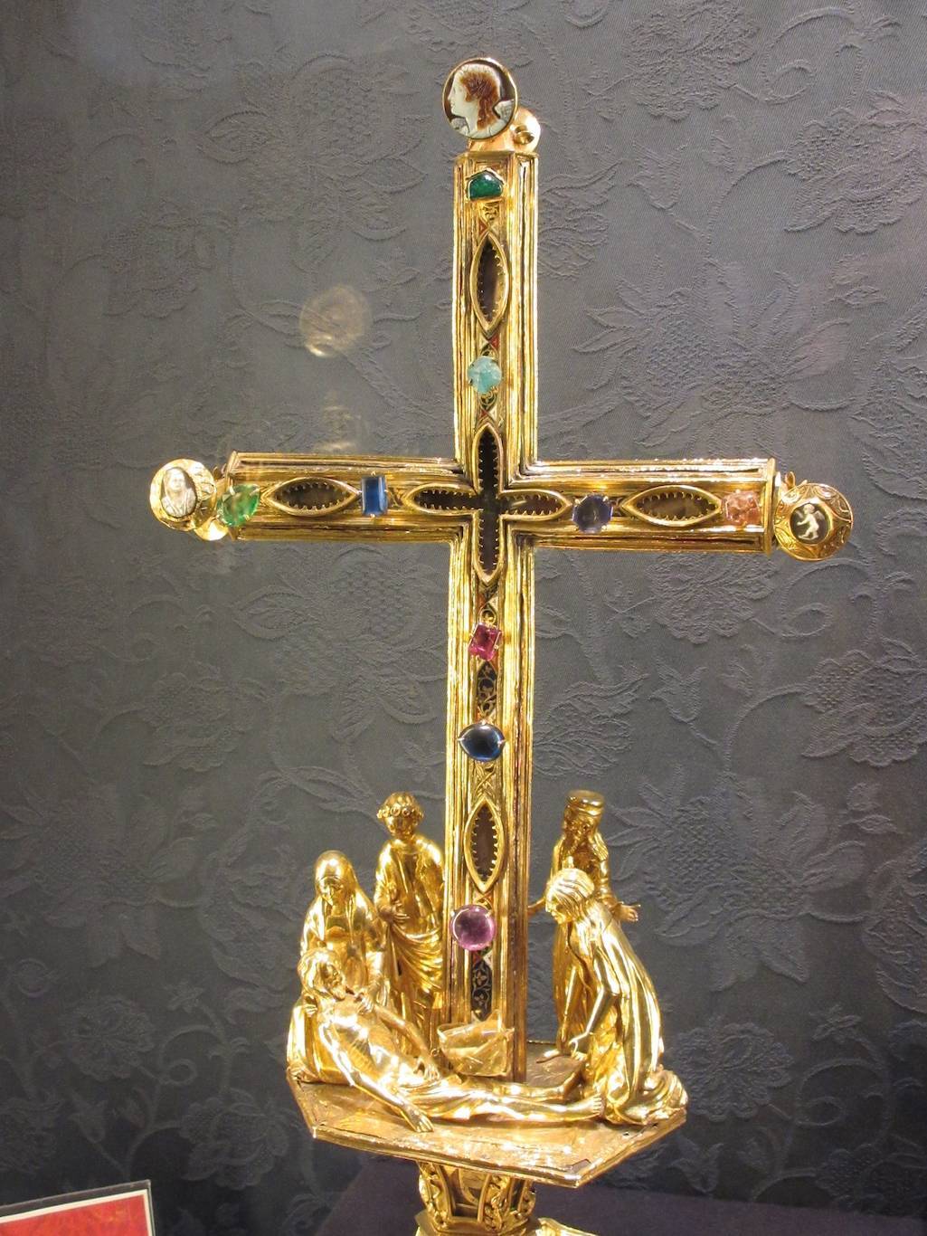 La procesión iba presidida por una importante reliquia del Lignum Crucis, engarzada en una extraordinaria pieza de orfebrería de la segunda mitad del siglo XIV, relacionada con el gótico francés, donada a la catedral por el arzobispo D. Pedro en 1389 y que es descrita como sigue (la traducción del latín procede del artículo citado en la bibliografía):