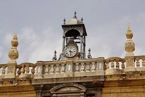 El sonido de las campanas del reloj del palacio de la Real Chancillería gobernaba las audiencias del tribunal. Ya existía en 1594, cuando se dispone que se sitúen en un lugar visible del edificio. En el siglo XVII, Henríquez de Jorquera da cuenta de que en una esquina del edificio de la Real Chancillería, “tiene su torre con su relox”. A mediados de siglo, debido al estado ruinoso en que se encontraba, se trasladó a otro sitio. A mediados del siglo XVIII, la campana del reloj daba las horas y los cuartos y se encontraba en la esquina derecha de la fachada, en una torre de madera. Se traslado en 1753 al otro ángulo de la fachada. Posiblemente en la remodelación de la balaustrada que se agregó en 1762 se ubicaran en la actual posición, el templete de metal en el centro de la cubierta del edificio. La campana de las horas es del siglo XV y la de los cuartos se fundió, en 1756, por el maestro de hacer campanas José Corona.
