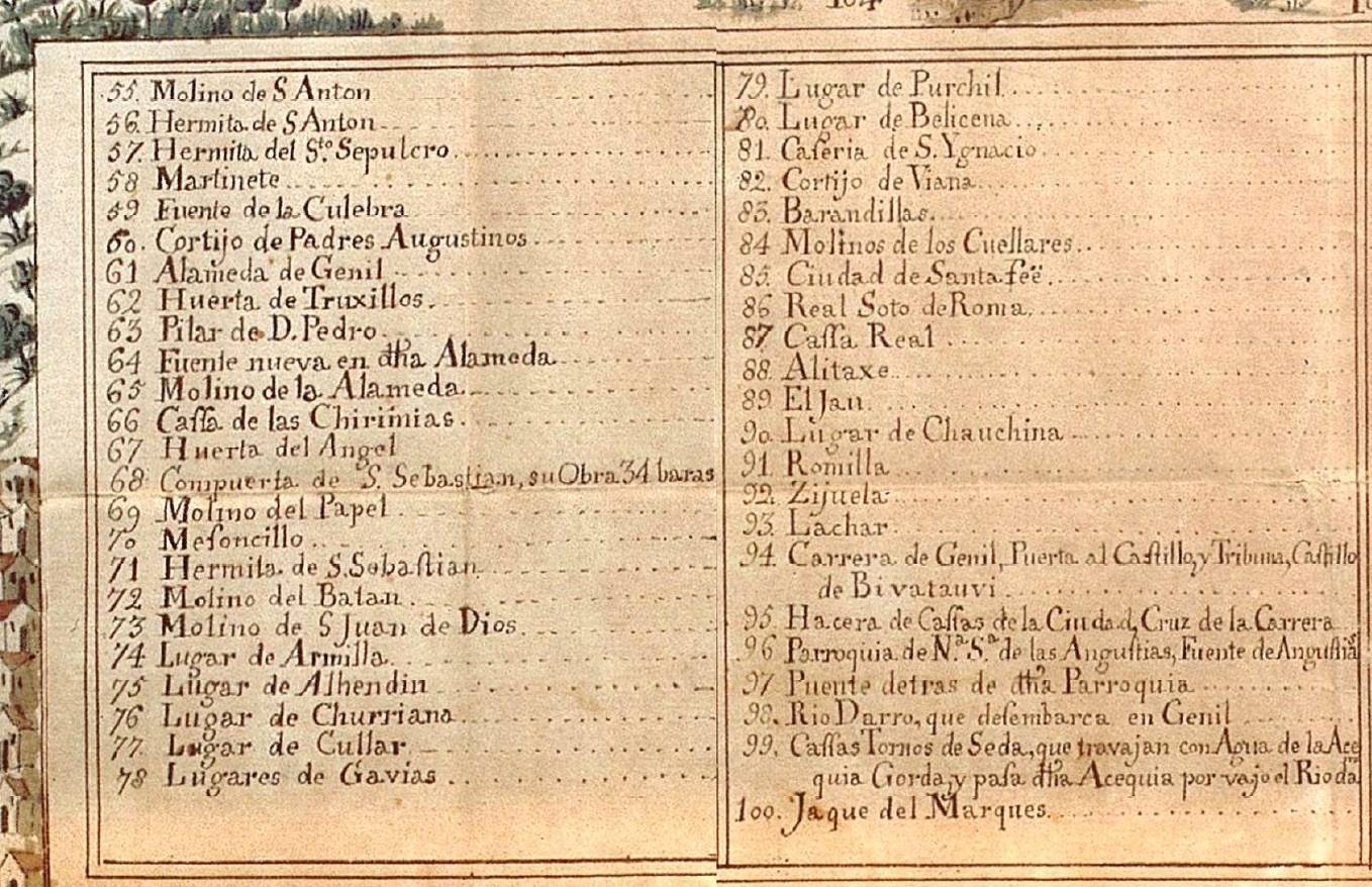 La Alameda es un espacio de paseo en el que al frescor del río y de la arboleda se le unen el que proporcionaba la importante acequia que lo rodeaba y que abastecía de agua a la huerta de Truxillos [nº 62], el pilar de Don Pedro [nº 63] y a dos molinos de papel [nº 65 y nº 69], como puede apreciarse en el Diseño del Río Genil de Granada, dibujado por Tomás Ferrer el 16 de octubre de 1751, con textos a cargo del escribano José de Tojar. En este interesante plano, podemos ver, en el centro de la Alameda [nº 61], una fuente monumental a la que se denomina “fuente Nueva” [nº 64], probablemente en alusión a su reciente construcción. Además, vecina a esta fuente y sobre la acequia citada, encontramos una segunda “casa de las Chirimías” [nº 66] que ha pasado totalmente desapercibida, de cuya construcción no tenemos más noticias, y que tendría una función similar a la que existía desde principios del siglo XVII en el paseo de la puerta de Guadix, la cual todavía se conserva.