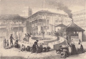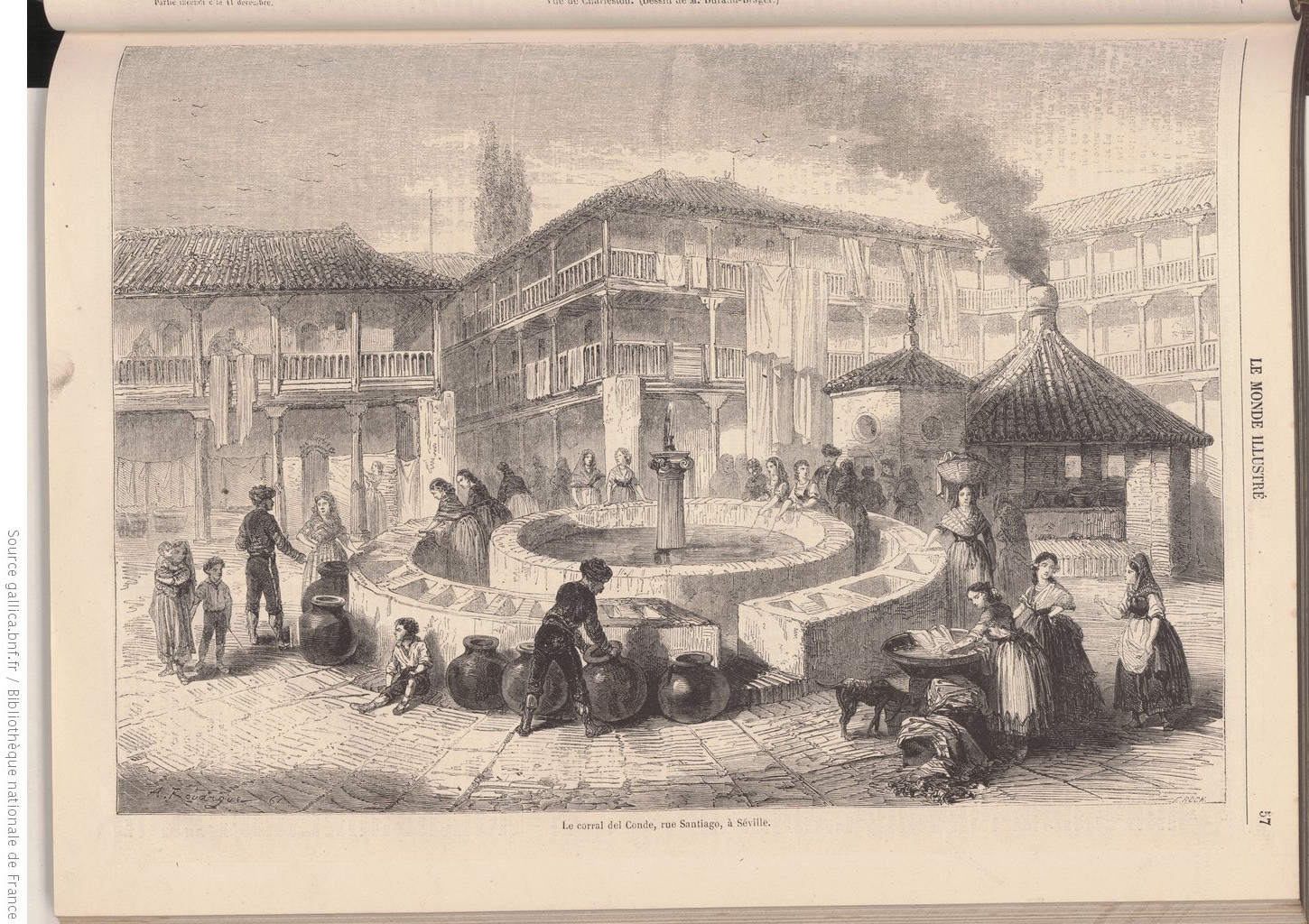 Charles Yriarte, en su artículo “Corral de[l] Conde calle de Santiago (Séville)” publicado en Le Monde Illustré de 25 de enero de 1862, nos proporciona una imagen decimonónica de este típico espacio urbano hispalense: