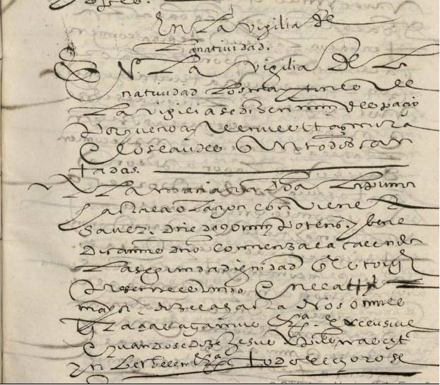 La festividad de la Natividad del Señor se iniciaba con las Vísperas el día 24 de diciembre. Su rango festivo era de primera clase y el color de sus ornamentos blanco. En el altar mayor se disponían los seis candeleros grandes [2], celebraba el deán [1, fol. 9r] [2] y seis prebendados se revestían de capas [2]. Al menos en el siglo XVI y en la sede de la antigua mezquita mayor adaptada al culto cristiano se colgaban los tapices “del Apocalipsis y otros paños” [1, fol. 30v].