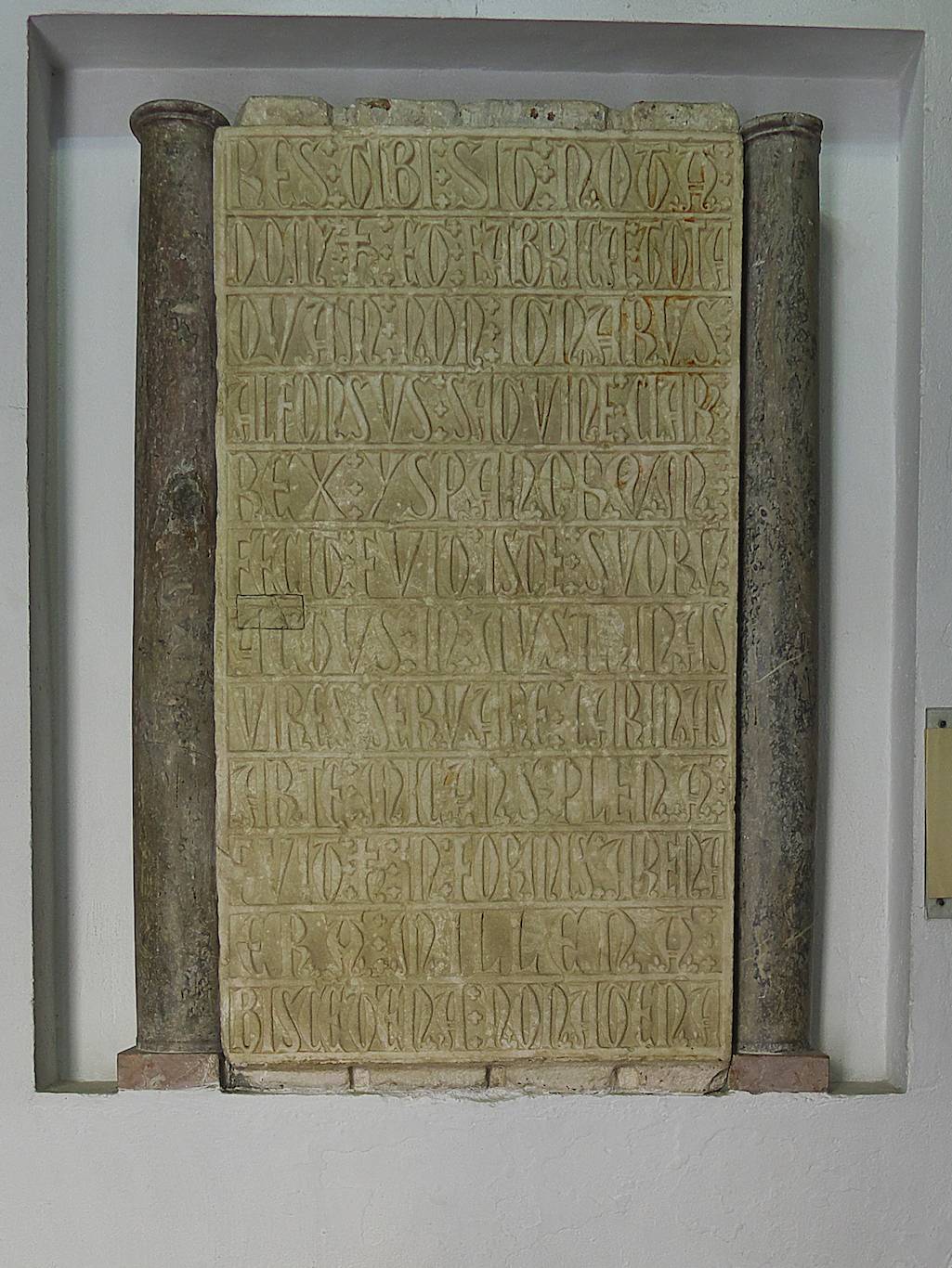 “Séate conocida cosa que esta casa y toda su fábrica hizo el Sabio y claro en sangre D. Alonso, Rey de los españoles. Fue este movido a reservar las galeras y naves de los suyos contra las fuerzas del viento austral, resplandeciendo con arte pleno lo que antes fue arenal informe. En la era de 1290 [año 1252].”