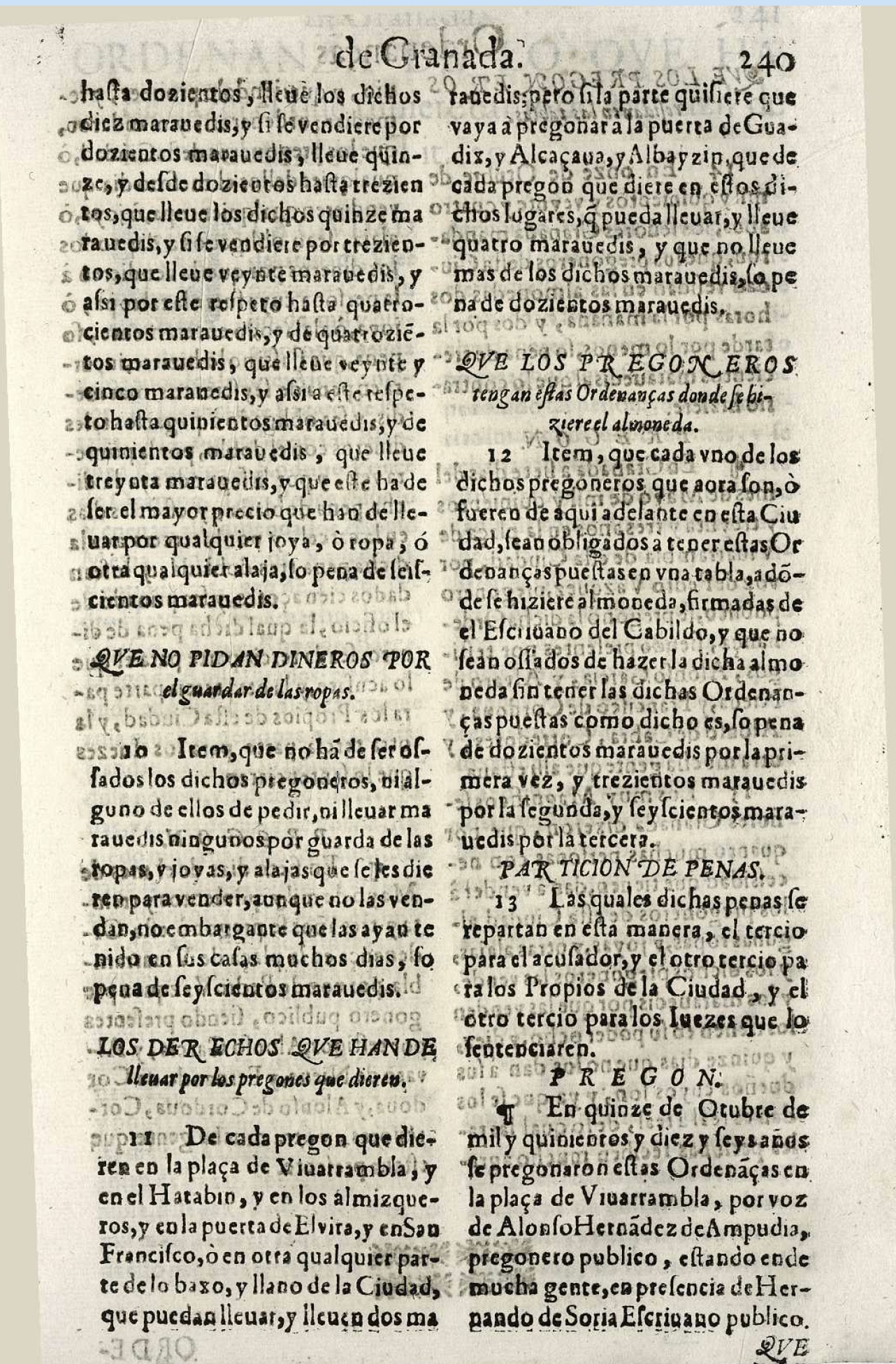 Las ordenanzas del gremio de los pregoneros de Granada se mandaron guardar por “los muy magníficos señores Justicia y Regimiento” el 7 de octubre de 1510. El pregón de venta de joyas, ropas y otros objetos, a solicitud de particulares, podía realizarse en cualquier parte de la ciudad. La cantidad que percibirían por cada pregón varía según el lugar en el que se hiciera, considerando una división del espacio urbano granadino en dos grandes zonas: el llano de la ciudad y lo que hoy conocemos como el Albaicín. Se estipulan dos maravedís para: la plaza de Bibarrambla, el Hatabín (plaza Nueva), los Almizqueros (Pilar del Toro), San Francisco, “o en otra cualquier parte de lo bajo y llano de la ciudad”. Pero si el que requería sus servicios quería que pregonara en la puerta de Guadix, la Alcazaba o el Albaicín, el precio se duplicaría a cuatro maravedís: “y que no lleve más de los dichos maravedís, so pena de doscientos maravedís”. Estas ordenanzas fueron pregonadas el 15 de octubre de 1516, en la plaza de Bibarrambla, por Alonso Hernández de Ampudia, pregonero público, “estando ende mucha gente” y en presencia del escribano público Hernando de Soria.