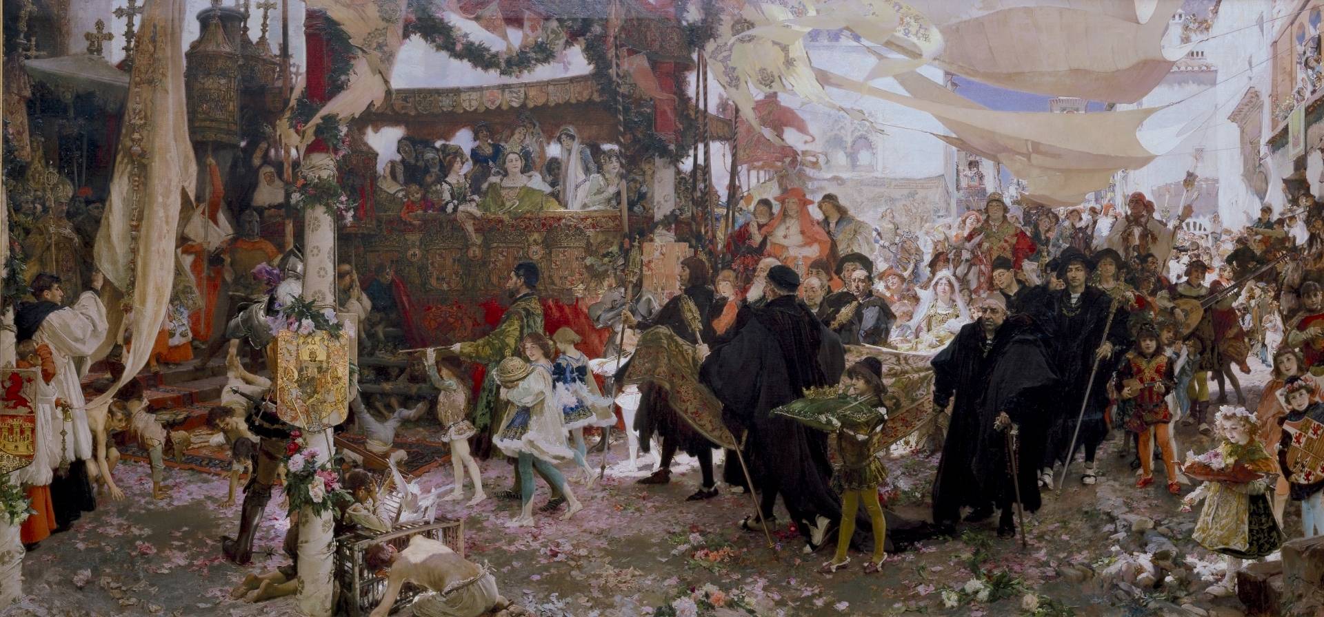 “Iba el rey delante de ella muy festivamente en una hacanea rucia, vestido de un rozagante brocado e chapado de oro, e un sombrero en la cabeza chapado de hilo de oro, e la guarnición de la hacanea era dorada de terciopelo negro. Iba la reina cabalgando en un trotón blanco, en una muy rica silla dorada, e una guarnición larga muy rica de oro y plata, e llevaba vestido un brial muy rico de brocado con muchas perlas y aljofar. Iba con ella la duquesa de Villahermosa, mujer del duque D. Alonso, hermano del rey, y no otra dueña ni doncella. Ibanles festivando muchos instrumentos de trompetas y chirimías e otras muchas cosas e acordadas músicas que iban delante de ellos. Iban allí muchos regidores de la ciudad a pie, los mejores; ibanles acompañando cuantos grandes había en la corte que iban alrededor de ellos, iba el condestable a la mano derecha de la reina, la mano puesta en las camas de la brida de la reina, y el conde de Benavente a la mano siniestra, de esta misa forma de este. Otros iban a sus pies y estribo, el adelantado de Andalucía y Fonseca, el señor de Alaejos. Iba el ama del príncipe encima de una mula en una albarda de terciopelo e con un repostero de brocado colorado llevaba al príncipe en sus brazos. Iban alrededor de él muchos grandes de la corte, junto con el ama iba el almirante de Castilla y todos estos grandes iban a pie. Este día dijéronle la misa en el altar mayor de la iglesia mayor muy festivamente.