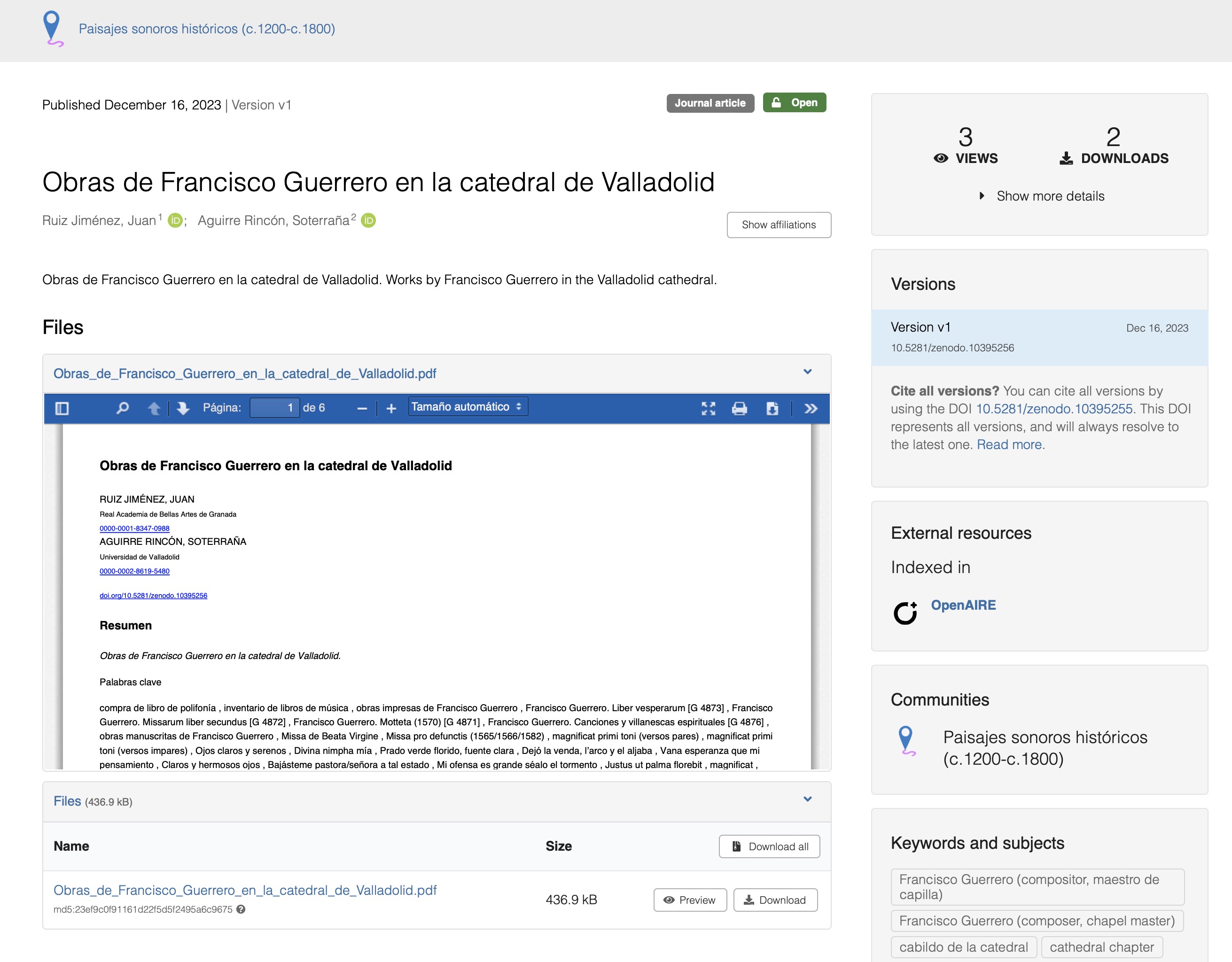 - Zenodo (Repositorio de acceso abierto de propósito general desarrollado bajo el programa europeo OpenAIRE). https://zenodo.org/communities/paisajes-sonoros-historicos.