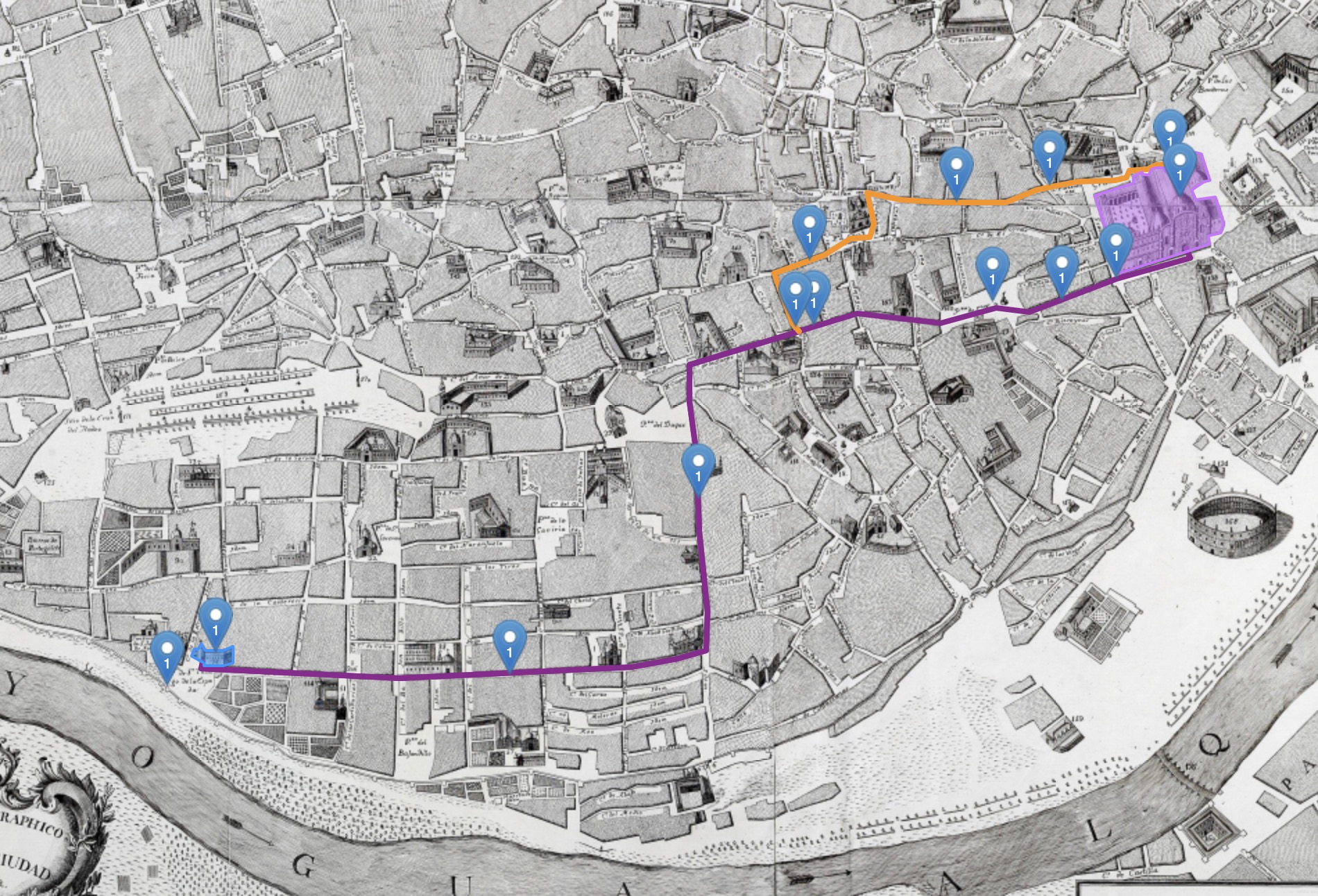 Entre los actos festivos que tuvieron lugar en Sevilla para conmemorar la Toma de Granada tuvo especial relevancia la procesión general que con la Virgen de los Reyes se hizo a la iglesia de Santiago el 29 de enero de 1492. En color violeta se indica el camino de ida y el tramo común de vuelta, mientras que en naranja se recoge el final del trayecto de regreso hasta el Corral de los Olmos de la catedral.